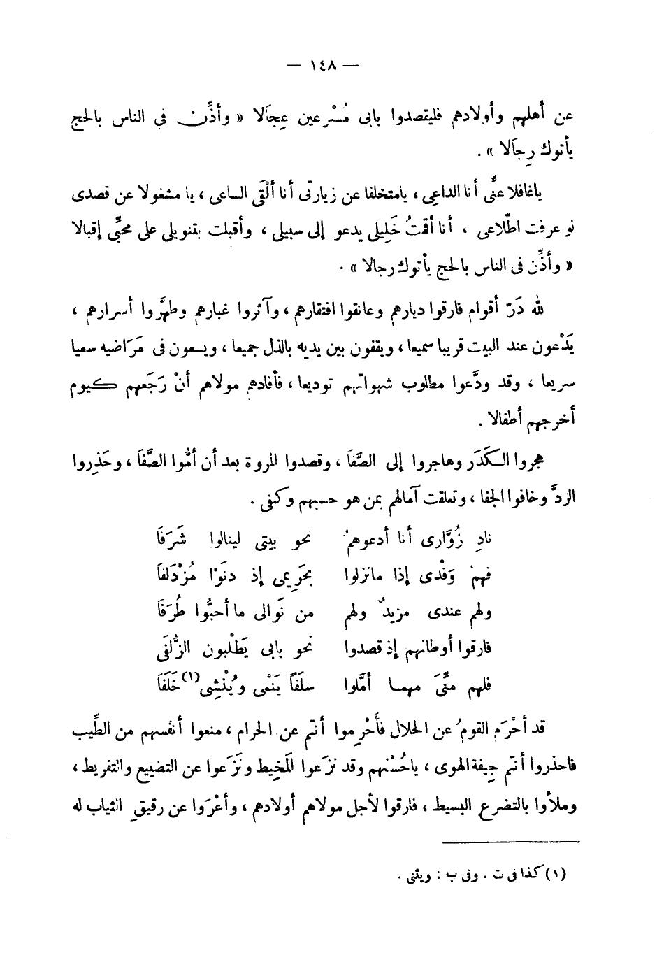 | عن أهلهم وأولادهم فليقصدوا بابي مسرعين عجالا ! 2 < وأذن في الناس بالحج يأتوك رجالا > 2 ! . | | يا غافلا عني أنا الداعي ، يا متخلفا عن زيارتي أنا ألقى الساعي ، يا مشغولا عن قصدي | لو عرفت اطلاعي ، أنا أقمت خليلي يدعو إلى سبيلي ، وأقبلت بتنويلي على محبي إقبالا | ! 2 < وأذن في الناس بالحج يأتوك رجالا > 2 ! . | | لله در أقوام فارقوا ديارهم وعانقوا افتقارهم ، وآثروا غبارهم وطهروا أسرارهم ، | يدعون عند البيت قريبا سميعا ، ويقفون بين يديه بالذل جميعا ، ويسعون في مراضيه سعيا | سريعا ، وقد ودعوا مطلوب شهواتهم توديعا ، فأفادهم مولاهم أن رجعهم كيوم | أخرجهم أطفالا . | | هجروا الكدر وهاجروا إلى الصفا ، وقصدوا المروة بعد أن أموا الصفا ، وحذروا | الرد وخافوا الجفا ، وتعلقت آمالهم بمن هو حسبهم وكفى . | | ( ناد زواري أنا أدعوهم % نحو بيتي لينالوا شرفا ) % | | ( فهم وفدي إذا ما نزلوا % بحريمي إذ دنوا مزدلفا ) % | | ( ولهم عندي مزيد ولهم % من نوالي ما أحبوا طرفا ) % | | ( فارقوا أوطانهم إذ قصدوا % نحو بابي يطلبون الزلفى ) % | | ( فلهم مني مهما أملوا % سلفا ينمى وينشي خلفا ) % | | قد أحرم القوم عن الحلال فأحرموا أنتم عن الحرام ، منعوا أنفسهم من الطيب | فاحذروا أنتم جيفة الهوى ، يا حسنهم وقد نزعوا المخيط ونزعوا عن التضييع والتفريط ، | وملأوا بالتضرع البسيط ، فارقوا لأجل مولاهم أولادهم ، وأعروا عن رقيق الثياب له |
