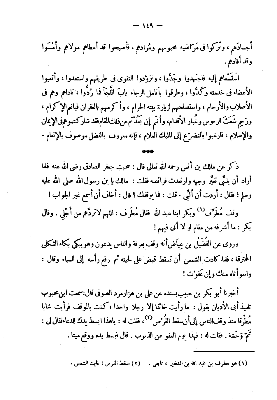 | أجسادهم ، وتركوا في مراضيه محبوبهم ومرادهم ، فأصبحوا قد أعطاهم مولاهم وأمسوا | وقد أفادهم . | | استسعاهم إليه فاجتهدوا وجدوا ، وتزودوا التقوى في طريقهم واستعدوا ، وأتعبوا | الأعضاء في خدمته وكدوا ، وطرقوا بأنامل الرجاء باب اللجا فما ردوا ، ناداهم وهم في | الأصلاب والأرحام ، واستصلحهم لزيارة بيته الحرام ، وأكرمهم بالغفران فيا نعم الإكرام ، | ورحم شعث الرؤوس وغبار الأقدام ، وأنتم إن بعدتم عن ذلك المقام فقد شاركتموهم في الإيمان | والإسلام ، فارغبوا بالتضرع إلى المليك العلام ، فإنه معروف بالفضل موصوف بالإنعام . | | ذكر عن مالك بن أنس رحمه الله تعالى قال : صحبت جعفر الصادق رضي الله عنه فلما | أراد أن يلبي تغير وجهه وارتعدت فرائصه فقلت : مالك يا ابن رسول الله صلى الله عليه وسلم | فقال : أردت أن ألبي . قلت : فما يوقفك ؟ قال : أخاف أن أسمع غير الجواب ! | | وقف مطرف وبكر ابنا عبد الله فقال مطرف : اللهم لا تردهم من أجلي . وقال | بكر : ما أشرفه من مقام لولا أني فيهم ! | | وروي عن الفضيل بن عياض أنه وقف بعرفة والناس يدعون وهو يبكي بكاء الثكلى | المحترقة ، فلما كادت الشمس أن تسقط قبض على لحيته ثم رفع رأسه إلى السماء وقال : | واسوأتاه منك وإن عفوت ! | | أخبرنا أبو بكر بن حبيب بسنده عن علي بن هزارمرد الصوفي قال : سمعت ابن محبوب | تلميذ أبي الأديان يقول : ما رأيت خائفا إلا رجلا واحدا ، كنت بالموقف فرأيت شابا | مطرقا منذ وقف الناس إلى أن سقط القرص ، فقلت له : يا هذا ابسط يدك للدعاء فقال لي : | ثم وحشة . فقلت له : فهذا يوم العفو عن الذنوب . قال فبسط يده ووقع ميتا . |