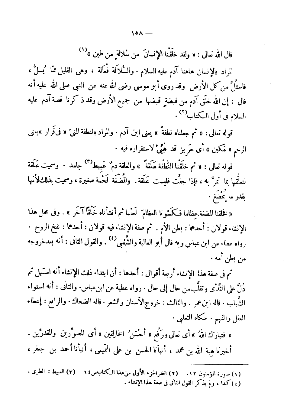 | | قال الله تعالى : ! 2 < ولقد خلقنا الإنسان من سلالة من طين > 2 ! . | | المراد بالإنسان هاهنا آدم عليه السلام . والسلالة فعالة ، وهي القليل مما يسل ، | فاستل من كل الأرض . وقد روى أبو موسى رضي الله عنه عن النبي صلى الله عليه وسلم أنه | قال : إن الله خلق آدم من قبضة قبضها من جميع الأرض وقد ذكرنا قصة آدم عليه | السلام في أول الكتاب . | | قوله تعالى : ! 2 < ثم جعلناه نطفة > 2 ! يعني ابن آدم . والمراد بالنطفة المني ! 2 < في قرار > 2 ! يعني | الرحم ! 2 < مكين > 2 ! أي حريز قد هيىء لاستقراره فيه . | | قوله تعالى : ^ ( ثم خلقنا النطقة علقة ) ^ والعلقة دم عبيط جامد . وسميت علقة | لتعلقها بما تمر به ، فإذا جفت فليست علقة . والمضغة لحمة صغيرة ، وسميت بذلك لأنها | بقدر ما يمضغ . | | ! 2 < فخلقنا المضغة عظاما فكسونا العظام لحما ثم أنشأناه خلقا آخر > 2 ! . وفي محل هذا | الإنشاء قولان : أحدهما : بطن الأم . ثم صفة الإنشاء فيه قولان : أحدهما : نفخ الروح . | رواه عطاء عن ابن عباس وبه قال أبو العالية والشعبي . والقول الثاني : أنه بعد خروجه | من بطن أمه . | | ثم في صفة هذا الإنشاء أربعة أقوال : أحدها : أن ابتداء ذلك الإنشاء أنه استهل ثم | دل على الثدي وتقلب من حال إلى حال . رواه عطية عن ابن عباس . والثاني : أنه استواء | الشباب . قاله ابن عمر . والثالث : خروج الأسنان والشعر . قاله الضحاك . والرابع : إعطاء | العقل والفهم . حكاه الثعلبي . | | ! 2 < فتبارك الله > 2 ! أي تعالى ورفع ! 2 < أحسن الخالقين > 2 ! أي المصورين والمقدرين . | أخبرنا هبة الله بن محمد ، أنبأنا الحسن بن علي التميمي ، أنبأنا أحمد بن جعفر ، |