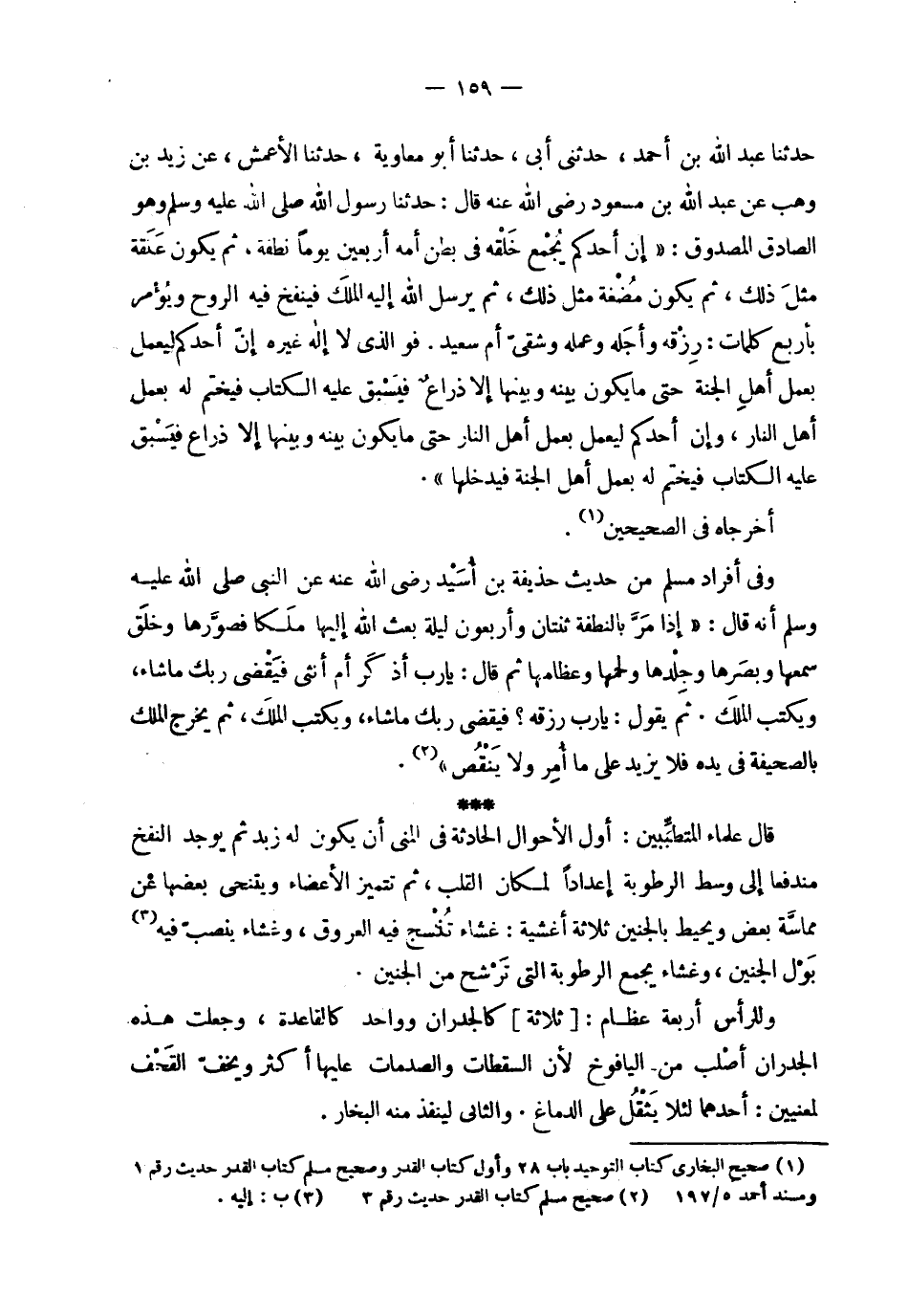 | حدثنا عبد الله بن أحمد ، حدثني أبي ، حدثنا أبو معاوية ، حدثنا الأعمش ، عن زيد بن | وهب عن عبد الله بن مسعود رضي الله عنه قال : حدثنا رسول الله صلى الله عليه وسلم وهو | الصادق المصدوق : ' إن أحدكم يجمع خلقه في بطن أمه أربعين يوما نطفة ، ثم يكون علقة | مثل ذلك ، ثم يكون مضغة مثل ذلك ، ثم يرسل الله إليه الملك فينفخ فيه الروح ويؤمر | بأربع كلمات : رزقه وأجله وعمله وشقي أم سعيد . فوالذي لا إله غيره إن أحدكم ليعمل | بعمل أهل الجنة حتى ما يكون بينه وبينها إلا ذراع فيسبق عليه الكتاب فيختم له بعمل | أهل النار ، وإن أحدكم ليعمل بعمل أهل النار حتى ما يكون بينه وبينها إلا ذراع فيسبق | عليه الكتاب فيختم له بعمل أهل الجنة فيدخلها ' . | | أخرجاه في الصحيحين . | | وفي أفراد مسلم من حديث حذيفة بن أسيد رضي الله عنه عن النبي صلى الله عليه وسلم | أنه قال : ' إذا مر بالنطفة ثنتان وأربعون ليلة بعث الله إليها ملكا فصورها وخلق | سمعها وبصرها وجلدها ولحمها وعظامها ثم قال : يا رب أذكر أم أنثى فيقضي ربك ما شاء ، | ويكتب الملك . ثم يقول : يا رب رزقه ؟ فيقضي ربك ما شاء ، ويكتب الملك ، ثم يخرج الملك | بالصحيفة في يده فلا يزيد على ما أمر ولا ينقص ' . | | قال علماء المتطببين : أول الأحوال الحادثة في المنى أن يكون له زبد ثم يوجد النفخ | مندفعا إلى وسط الرطوبة إعدادا لمكان القلب ، ثم تتميز الأعضاء ويتنحى بعضها عن | مماسة بعض ويحيط بالجنين ثلاثة أغشية : غشاء تنسج فيه العروق ، وغشاء ينصب فيه | بول الجنين ، وغشاء يجمع الرطوبة التي ترشح من الجنين . | | وللرأس أربعة عظام : [ ثلاثة ] كالجدران وواحد كالقاعدة ، وجعلت هذه | الجدرن أصلب من اليافوخ لأن السقطات والصدمات عليها أكثر ويخف القحف | لمعنيين : أحدهما لئلا يثقل على الدماغ . والثاني لينفذ منه البخار . |