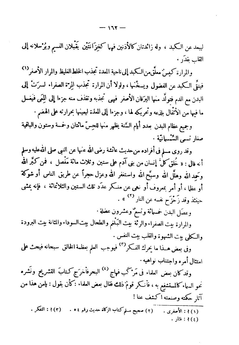 | ليبعد عن الكبد ، وله زائدتان كالأذنين فهما كخزانتين يقبلان النسيم ويرسلانه إلى | القلب بقدر . | | والمرارة كيس معلق من الكبد إلى ناحية المعدة تجذب الخلط الغليظ والمرار الأصفر | فينقى الكبد عن الفضول ويسخنها ، ولولا أن المرارة تجذب المرة الصفراء لسرت إلى | البدن مع الدم فتولد منها اليرقان الأصفر فهي تجذبه وتقذف منه جزءا إلى المعى فيغسل | ما فيها من الأثقال بلذعه وتحريكه لها ، وجزءا إلى المعدة ليعينها بحرارته على الهضم . | | وجميع عظام البدن بعدد أيام السنة يظهر منها للحس مائتان وخمسة وستون والباقية | صغار تسمى السمسمانية . | | وقد روى مسلم في أفراده من حديث عائشة رضي الله عنها عن النبي صلى الله عليه وسلم | أنه قال : ' خلق كل إنسان من بني آدم على ستين وثلاث مائة مفصل ، فمن كبر الله | وحمد الله وهلل الله وسبح الله واستغفر الله وعزل حجرا عن طريق الناس أو شوكة | أو عظما ، أو أمر بمعروف أو نهى عن منكر عدد تلك الستين والثلاثمائة ، فإنه يمشي | حينئذ وقد زحزح نفسه عن النار ' . | | وعضل البدن خمسمائة وتسع وعشرون عضلة . | | والمرارة بيت الصفراء والرئة بيت البلغم والطحال بيت السوداء والمثانة بيت البرودة | والكلى بيت الشهوة والقلب بيت النفس . | | وفي بعض هذا ما يحرك الفكر فيوجب العلم بعظمة الخالق سبحانه فيحث على | امتثال أمره واجتناب نواهيه . | | وقد كان بعض العلماء في مركب فهاج البحر فأخرج كتاب التشريح ونشره | نحو السماء كالمستشفع به ، فأنكر قوم ذلك فقال بعض العلماء : كأن يقول : يا من هذا من | آثار حكمته وصنعته اكشف عنا ! |