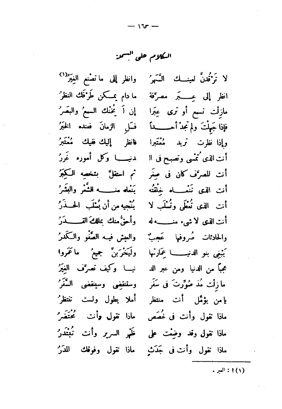 | الكلام على البسملة | | ( لا ترقدن لعينك السهر % وانظر إلى ما تصنع الغير ) % | | ( انظر إلى عبر مصرفة % ما دام يمكن طرفك النظر ) % | | ( ما زلت تسمع أو ترى عبرا % إن لم يخنك السمع والبصر ) % | | ( فإذا جهلت ولم تجد أحدا % فسل الزمان فعنده الخبر ) % | | ( وإذا نظرت تريد معتبرا % فانظر إليك ففيك معتبر ) % | | ( أنت الذي تمسي وتصبح في % الدنيا وكل أموره غرر ) % | | ( أنت المصرف كان في صغر % ثم استقل بشخصه الكبر ) % | | ( أنت الذي تنعاه خلقته % ينعاه منه الشعر والبشر ) % | | ( أنت الذي تعطي وتسلب لا % ينجيه من أن يسلب الحذر ) % | | ( أنت الذي لا شيء منه له % وأحق منك بملك القدر ) % | | ( والحادثات صروفها عجب % والعيش فيه الصفو والكدر ) % | | ( يبغي بنو الدنيا عمارتها % وليخربن جميع ما عمروا ) % | | ( عجبا من الدنيا ومن عبر الدنيا % وكيف تصرف الغير ) % | | ( ما زلت مذ صورت في سفر % وستنقضي وسينقضي السفر ) % | | ( يا من يؤمل أنت منتظر % أملا يطول ولست تنتظر ) % | | ( ماذا تقول وأنت في غصص % ماذا تقول وأنت محتضر ) % | | ( ماذا تقول وقد وضعت على % ظهر السرير وأنت تبتدر ) % | | ( ماذا تقول وأنت في جدث % ماذا تقول وفوقك المدر ) % |
