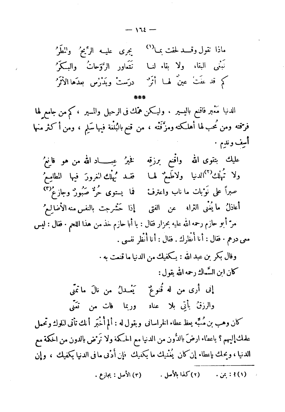 | | ( % ماذا تقول وقد لحقت بما % يجري عليه الريح والمطر ) % | | ( نبغي البقاء ولا بقاء لنا % تتعاور الروحات والبكر ) % | | ( كم قد عفت عين لها أثر % درست ويدرس بعدها الأثر ) % | | الدنيا معبر فاقنع باليسير ، وليكن همك في الرحيل والمسير ، كم من جامع لها | فرقته ومن محب لها أهلكته ومزقته ، من قنع بالبلغة فيها سلم ، ومن أكثر منها | أسف وندم . | | ( عليك بتقوى الله واقنع برزقه % فخير عباد الله من هو قانع ) % | | ( ولا تهلك الدنيا ولا طمع لها % فقد يهلك المغرور فيها المطامع ) % | | ( صبرا على نوبات ما ناب واعترف % فما يستوي حر صبور وجازع ) % | | ( أعاذل ما يغني الثراء عن الفتى % إذا حشرجت بالنفس منه الأضالع ) % | | مر أبو حازم رحمه الله بجزار فقال : يا أبا حازم خذ من هذا اللحم . فقال : ليس | معي درهم . فقال : أنا أنظرك . فقال : أنا أنظر نفسي . | | وقال بكر بن عبد الله : يكفيك من الدنيا ما قنعت به . | | كان ابن السماك رحمه الله يقول : | | ( إني أرى من له قنوع % يعدل من نال ما تمنى ) % | | ( والرزق يأتي بلا عناء % وربما فات من تعنى ) % | | كان وهب بن منبه يعظ عطاء الخراساني ويقول له : ألم أخبر أنك تأتي الملوك وتحمل | علمك إليهم ؟ يا عطاء ارض بالدون من الدنيا مع الحكمة ولا ترض بالدون من الحكمة مع | الدنيا ، ويحك يا عطاء إن كان يغنيك ما يكفيك فإن أدنى ما في الدنيا يكفيك ، وإن |