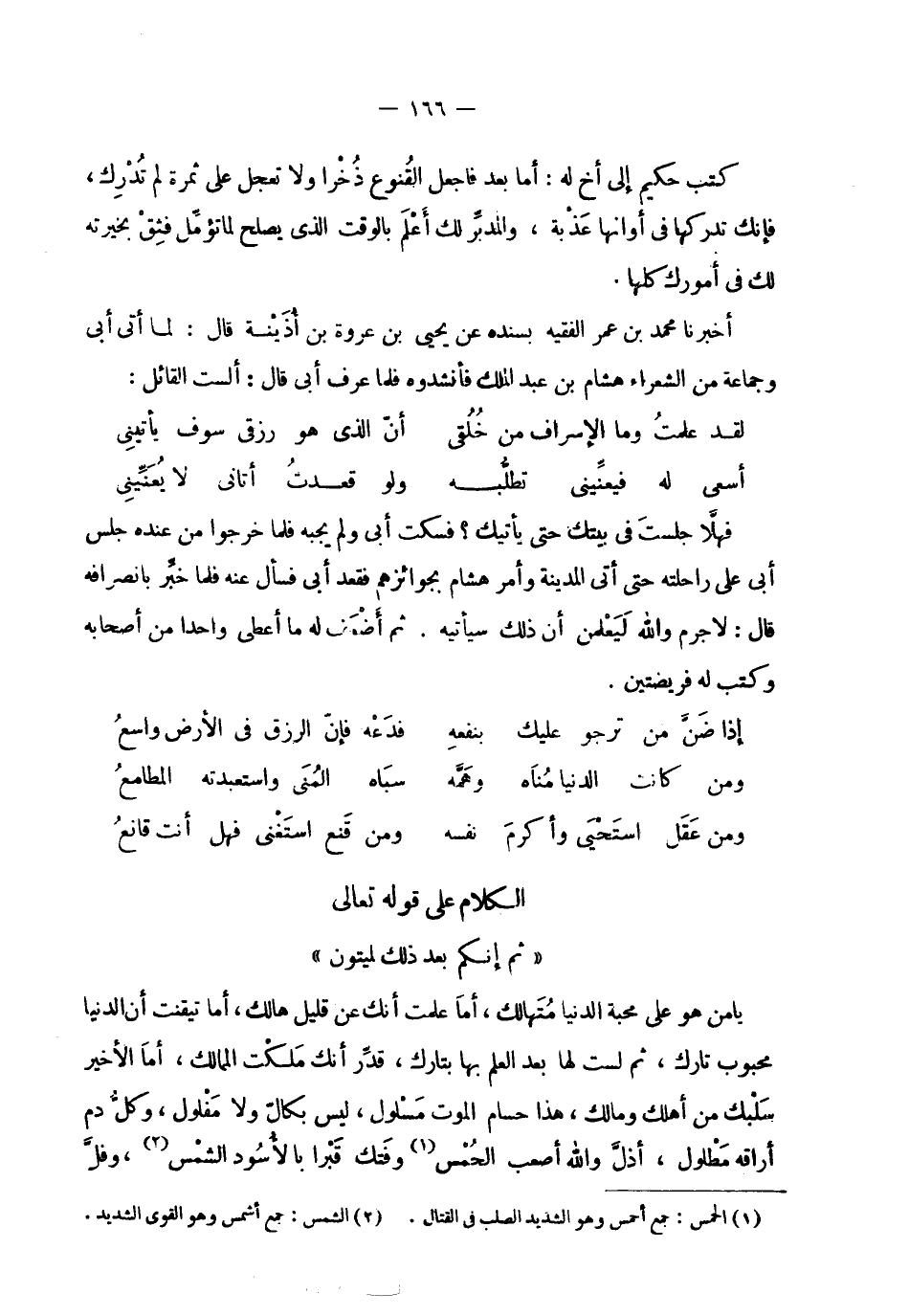 | | كتب حكيم إلى أخ له : أما بعد فاجعل القنوع ذخرا ولا تعجل على ثمرة لم تدرك ، | فإنك تدركها في أوانها عذبة ، والمدبر لك أعلم بالوقت الذي يصلح لما تؤمل فثق بخيرته | لك في أمورك كلها . | | أخبرنا محمد بن عمر الفقيه بسنده عن يحيى بن عروة بن أذينة قال : لما أتى أبي | وجماعة من الشعراء هشام بن عبد الملك فأنشدوه فلما عرف أبي قال : ألست القائل : | | ( لقد علمت وما الإسراف من خلقي % أن الذي هو رزقي سوف يأتيني ) % | | ( أسعى له فيعنيني تطلبه % ولو قعدت أتاني لا يعنيني ) % | | فهلا جلست في بيتك حتى يأتيك ؟ فسكت أبي ولم يجبه فلما خرجوا من عنده جلس | أبي على راحلته حتى أتى المدينة وأمر هشام بجوائزهم فقعد أبي فسأل عنه فلما خبر بانصرافه | قال : لا جرم والله ليعلمن أن ذلك سيأتيه . ثم أضعف له ما أعطى واحدا من أصحابه | وكتب له فريضتين . | | ( إذا ضن من ترجو عليك بنفعه % فدعه فإن الرزق في الأرض واسع ) % | | ( ومن كانت الدنيا مناه وهمه % سباه المنى واستعبدته المطامع ) % | | ( ومن عقل استحيى وأكرم نفسه % ومن قنع استغنى فهل أنت قانع ) % | الكلام على قوله تعالى | ! 2 < ثم إنكم بعد ذلك لميتون > 2 ! | يا من هو على محبة الدنيا متهالك ، أما علمت أنك عن قليل هالك ، أما تيقنت أن الدنيا | محبوب تارك ، ثم لست لها بعد العلم بها بتارك ، قدر أنك ملكت الممالك ، أما الأخير | سلبك من أهلك ومالك ، هذا حسام الموت مسلول ، ليس بكال ولا مفلول ، وكل دم | أراقه مطلول ، أذل والله أصعب الحمس وفتك قبرا بالأسود الشمس ، وفل |