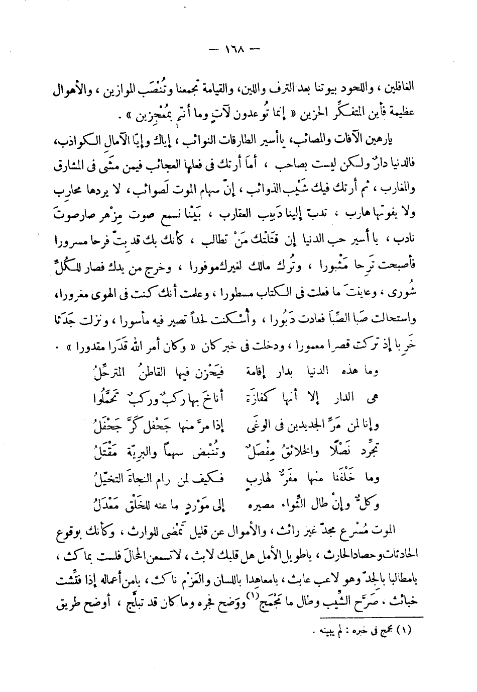| الغافلين ، واللحود بيوتنا بعد الترف واللين ، والقيامة تجمعنا وتنصب الموازين ، والأهوال | عظيمة فأين المتفكر الحزين ^ ( إنما توعدون لآت وما أنتم بمعجزين ) ^ . | | يا رهين الآفات والمصائب ، يا أسير الطارقات النوائب ، إياك وإيا الآمال الكواذب ، | فالدنيا دار ولكن ليست بصاحب ، أما أرتك في فعلها العجائب فيمن مشى في المشارق | والمغارب ، ثم أرتك فيك شيب الذوائب ، إن سهام الموت لصوائب ، لا يردها محارب | ولا يفوتها هارب ، تدب إلينا دبيب العقارب ، بينا نسمع صوت مزهر صار صوت | نادب ، يا أسير حب الدنيا إن قتلتك من تطالب ، كأنك بك قد بت فرحا مسرورا | فأصبحت ترحا مثبورا ، وترك مالك لغيرك موفورا ، وخرج من يدك فصار للكل | شورى ، وعاينت ما فعلت في الكتاب مسطورا ، وعلمت أنك كنت في الهوى مغرورا ، | واستحالت صبا الصبا فعادت دبورا ، وأسكنت لحدا تصير فيه مأسورا ، ونزلت جدثا | خربا إذ تركت قصرا معمورا ، ودخلت في خبر كان ! 2 < وكان أمر الله قدرا مقدورا > 2 ! . | | ( وما هذه الدنيا بدار إقامة % فيحزن فيها القاطن المترحل ) % | | ( هي الدار إلا أنها كمفازة % أناخ بها ركب وركب تحملوا ) % | | ( وإنا لمن مر الجديدين في الوغى % إذا مر منها جحفل كر جحفل ) % | | ( تجرد نصلا والخلائق مفصل % وتنبض سهما والبرية مقتل ) % | | ( وما خلفنا منها مفر لهارب % فكيف لمن رام النجاة التخيل ) % | | ( وكل وإن طال الثواء مصيره % إلى مورد ما عنه للخلق معدل ) % | | الموت مسرع مجد غير لابث ، والأموال عن قليل تمضي للوارث ، وكأنك بوقوع | الحادثات وحصاد الحارث ، يا طويل الأمل هل قلبك لا بث ، لا تسمعن المحال فلست بماكث ، | يا مطالبا بالجد وهو لاعب عابث ، يا معاهدا باللسان والعزم ناكث ، يا من أعماله إذا فتشت | خبائث ، صرح الشيب وطال ما مجمج ووضح فجره وما كان قد تبلج ، أوضح طريق |