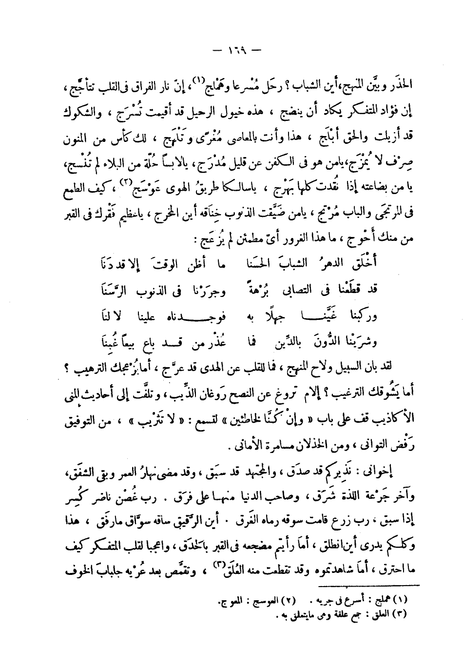| الحذر وبين المنهج ، أين الشباب ؟ رحل مسرعا وهملج ، إن نار الفراق في القلب تتأجج ، | إن فؤاد المتفكر يكاد أن ينضج ، هذه خيول الرحيل قد أقيمت تسرج ، والشكوك | قد أزيلت والحق أبلج ، هذا وأنت بالمعاصي مغرى وتلهج ، لك كأس من المنون | صرف لا يمزج ، يا من هو في الكفن عن قليل مدرج ، يا لابسا حلة من البلاء لم تنسج ، | يا من بضاعته إذا نقدت كلها بهرج ، يا سالكا طريق الهوى عوسج ، كيف الطمع | في المرتجى والباب مرتج ، يا من ضيقت الذنوب خناقه أين المخرج ، يا عظيم فقرك في القبر | من منك أحوج ، ما هذا الغرور أي مطمئن لم يزعج : | | ( أخلق الدهر الشباب الحسنا % ما أظن الوقت إلا قد دنا ) % | | ( قد قطعنا في التصابي برهة % وجررنا في الذنوب الرسنا ) % | | ( وركبنا غينا جهلا به % فوجدناه علينا لا لنا ) % | | ( وشرينا الدون بالدين فما % عذر من قد باع بيعا غبنا ) % | | لقد بان السبيل ولاح المنهج ، فما للقلب عن الهدى قد عرج ، أما يزعجك الترهيب ؟ | أما يشوقك الترغيب ؟ إلام تروغ عن النصح روغان الذيب ، وتلفت إلى أحاديث المنى | الأكاذيب قف على باب ! 2 < وإن كنا لخاطئين > 2 ! لتسمع : ^ ( ولا تثريب ) ^ ، من التوفيق | رفض التواني ، ومن الخذلان مسامرة الأماني . | | إخواني : نذيركم قد صدق ، والمجتهد قد سبق ، وقد مضى نهار العمر وبقي الشفق ، | وآخر جرعة اللذة شرق ، وصاحب الدنيا منها على فرق . رب غصن ناضر كسر | إذا سبق ، رب زرع قامت سوقه رماه الغرق . أين الرقيق ساقه سواق ما رفق ، هذا | وكلكم يدري أين انطلق ، أما رأيتم مضجعه في القبر بالحدق ، واعجبا لقلب المتفكر كيف | ما احترق ، أما شاهدتموه وقد تقطعت منه العلق ، وتقمص بعد عريه جلباب الخوف |
