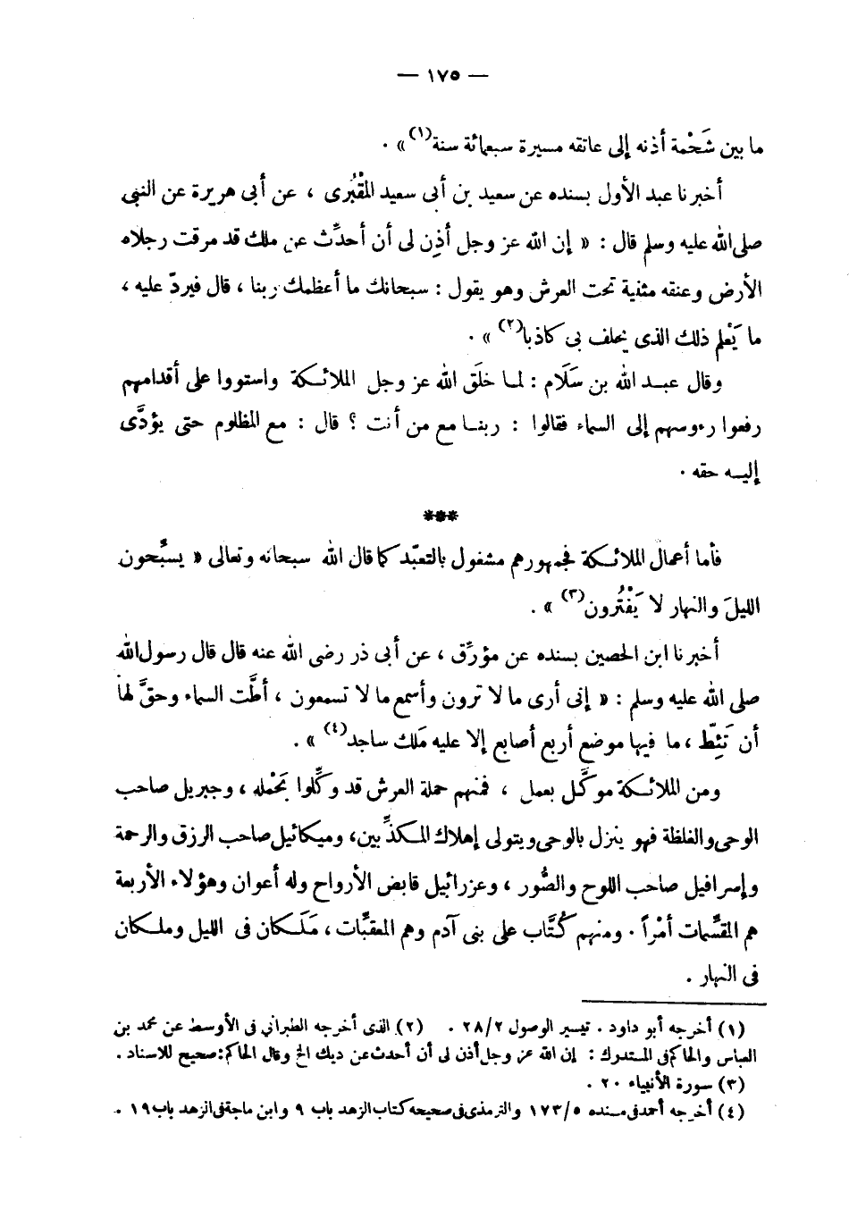 | ما بين شحمة أذنه إلى عاتقه مسيرة سبعمائة سنة ' . | | أخبرنا عبد الأول بسنده عن سعيد بن أبي سعيد المقبري ، عن أبي هريرة عن النبي | صلى الله عليه وسلم قال : ' إن الله عز وجل أذن لي أن أحدث عن ملك قد مرقت رجلاه | الأرض وعنقه مثنية تحت العرش وهو يقول : سبحانك ما أعظمك ربنا ، قال فيرد عليه ، | ما يعلم ذلك الذي يحلف بي كاذبا ' . | | وقال عبد الله بن سلام : لما خلق الله عز وجل الملائكة واستووا على أقدامهم | رفعوا رؤوسهم إلى السماء فقالوا : ربنا مع من أنت ؟ قال : مع المظلوم حتى يؤدى | إليه حقه . | | فأما أعمال الملائكة فجمهورهم مشغول بالتعبد كما قال الله سبحانه وتعالى ! 2 < يسبحون الليل والنهار لا يفترون > 2 ! . | | أخبرنا ابن الحصين بسنده عن مؤرق ، عن أبي ذر رضي الله عنه قال قال رسول الله | صلى الله عليه وسلم : ' إني أرى ما لا ترون وأسمع ما لا تسمعون ، أطت السماء وحق لها | أن تئط ، ما فيها موضع أربع أصابع إلا عليه ملك ساجد ' . | | ومن الملائكة موكل بعمل ، فمنهم حملة العرش قد وكلوا بحمله ، وجبريل صاحب | الوحي والغلظة فهو ينزل بالوحي ويتولى إهلاك المكذبين ، وميكائيل صاحب الرزق والرحمة | وإسرافيل صاحب اللوح والصور ، وعزرائيل قابض الأرواح وله أعوان وهؤلاء الأربعة | هم المقسمات أمرا . ومنهم كتاب على بني آدم وهم المعقبات ، ملكان في الليل وملكان | في النهار . |