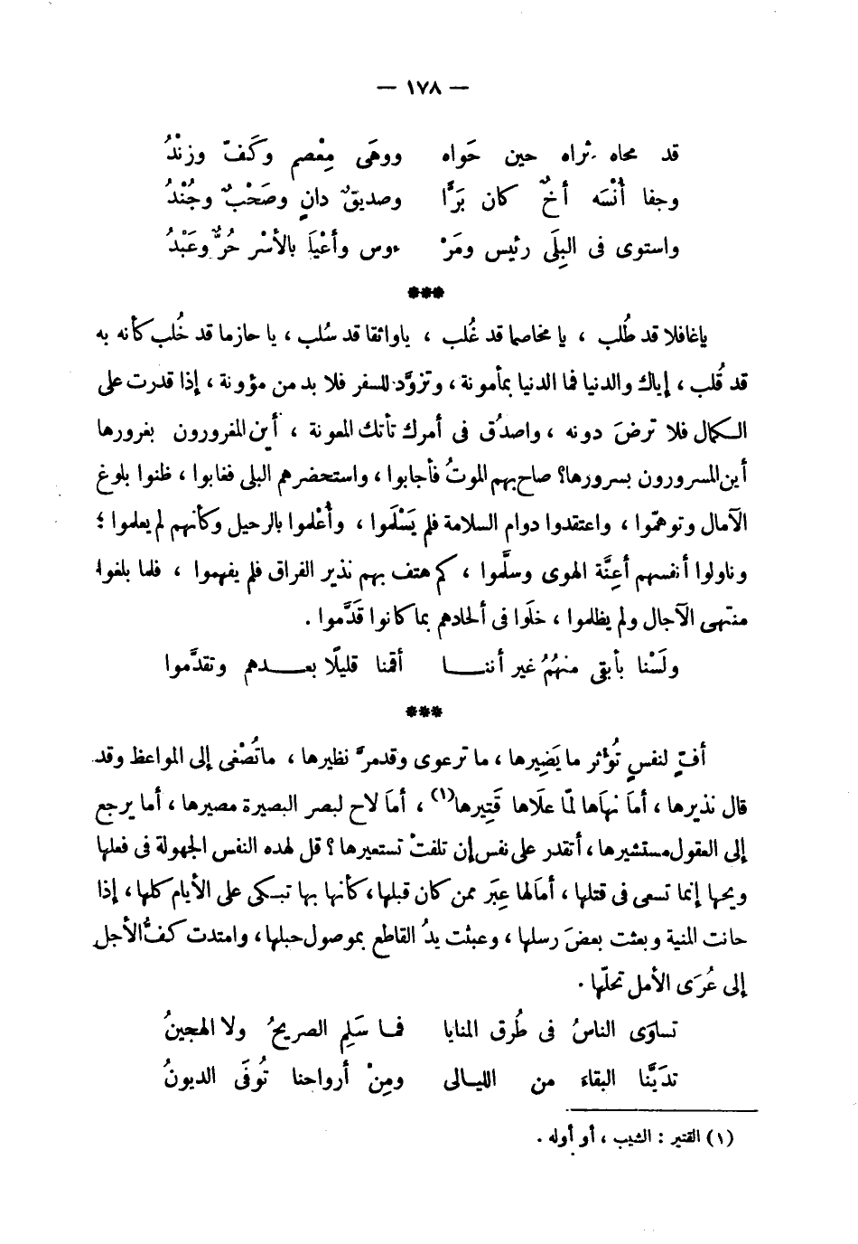 | | ( قد محاه ثراه حين حواه % ووهى معصم وكف وزند ) % | | ( وجفا أنسه أخ كان برا % وصديق دان وصحب وجند ) % | | ( واستوى في البلى رئيس ومرؤوس % وأعيا بالأسر حر وعبد ) % | | يا غافلا قد طلب ، يا مخاصما قد غلب ، يا واثقا قد سلب ، يا حازما قد خلب كأنه به | قد قلب ، إياك والدنيا فما الدنيا بمأمونة ، وتزود للسفر فلا بد من مؤونة ، إذا قدرت على | الكمال فلا ترض دونه ، واصدق في أمرك تأتك المعونة ، أين المغرورون بغرورها | أين المسرورون بسرورها ؟ صاح بهم الموت فأجابوا ، واستحضرهم البلى فغابوا ، ظنوا بلوغ | الآمال وتوهموا ، واعتقدوا دوام السلامة فلم يسلموا ، وأعلموا بالرحيل وكأنهم لم يعلموا ، | وناولوا أنفسهم أعنة الهوى وسلموا ، كم هتف بهم نذير الفراق فلم يفهموا ، فلما بلغوا | منتهى الآجال ولم يظلموا ، خلوا في ألحادهم بما كانوا قدموا . | | ( ولسنا بأبقى منهم غير أننا % أقمنا قليلا بعدهم وتقدموا ) % | | أف لنفس تؤثر ما يضيرها ، ما ترعوى وقد مر نظيرها ، ما تصغي إلى المواعظ وقد | قال نذيرها ، أما نهاها لما علاها قتيرها ، أما لاح لبصر البصيرة مصيرها ، أما يرجع | إلى العقول مستشيرها ، أتقدر على نفس إن تلفت تستعيرها ؟ قل لهذه النفس الجهولة في فعلها | ويحها إنما تسعى في قتلها ، أما لها عبر ممن كان قبلها ، كأنها بها تبكي على الأيام كلها ، إذا | حانت المنية وبعثت بعض رسلها ، وعبثت يد القاطع بموصول حبلها ، وامتدت كف الأجل | إلى عرى الأمل تحلها . | | ( تساوى الناس في طرق المنايا % فما سلم الصريح ولا الهجين ) % | | ( تدينا البقاء من الليالي % ومن أرواحنا توفى الديون ) % |