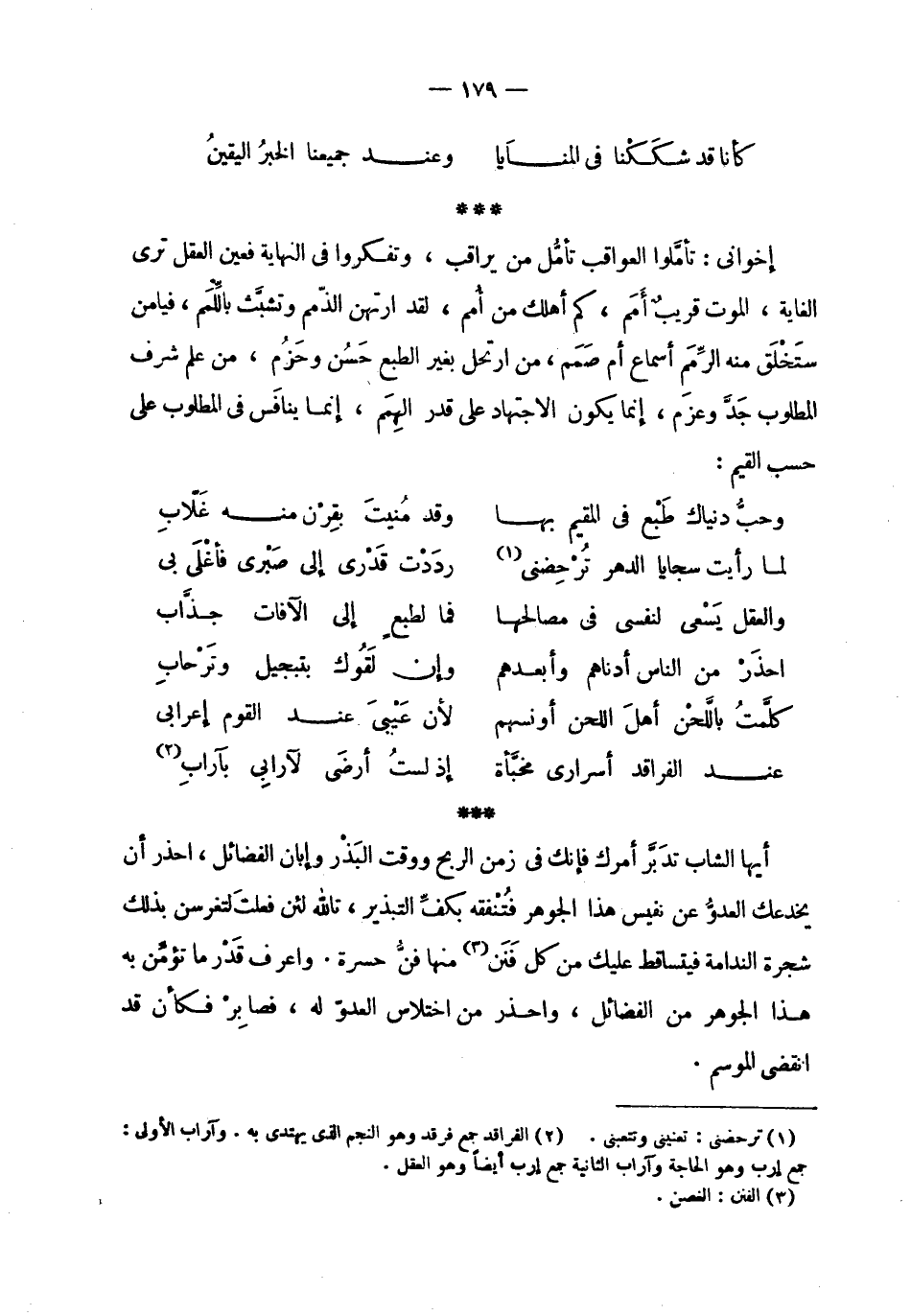 | | ( كأنا قد شككنا في المنايا % وعند جميعنا الخبر اليقين ) % | | إخواني : تأملوا العواقب تأمل من يراقب ، وتفكروا في النهاية فعين العقل ترى | الغاية ، الموت قريب أمم ، كم أهلك من أمم ، لقد ارتهن الذمم وتشبث باللمم ، فيا من | ستخلق منه الرمم أسماع أم صمم ، من ارتحل بغير الطبع حسن وحزم ، من علم شرف | المطلوب جد وعزم ، إنما يكون الاجتهاد على قدر الهمم ، إنما ينافس في المطلوب على | حسب القيم : | | ( وحب دنياك طبع في المقيم بها % وقد منيت بقرن منه غلاب ) % | | ( لما رأيت سجايا الدهر ترحضني % رددت قدري إلى صبري فأغلى بي ) % | | ( والعقل يسعى لنفسي في مصالحها % فما لطبع إلى الآفات جذاب ) % | | ( احذر من الناس أدناهم وأبعدهم % وإن لقوك بتبجيل وترحاب ) % | | ( كلمت باللحن أهل اللحن أونسهم % لأن عيبي عند القوم إعرابي ) % | | ( عند الفراقد أسراري مخبأة % إذ لست أرضى لآرابي بآراب ) % | | أيها الشاب تدبر أمرك فإنك في زمن الربح ووقت البذر وإبان الفضائل ، احذر أن | يخدعك العدو عن نفيس هذا الجوهر فتنفقه بكف التبذير ، تالله لئن فعلت لتغرسن بذلك | شجرة الندامة فيتساقط عليك من كل فنن منها فن حسرة . واعرف قدر ما تؤمن به | هذا الجوهر من الفضائل ، واحذر من اختلاس العدو له ، فصابر فكأن قد | انقضى الموسم . |