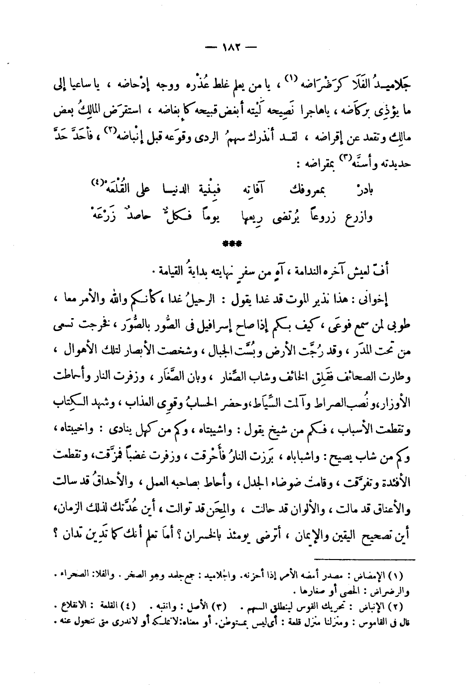 | جلاميد الفلا كرضراضه ، يا من يعلم غلط عذره ووجه إدحاضه ، يا ساعيا إلى | ما يؤذي بركاضه ، يا هاجرا نصيحه ليته أبغض قبيحه كإبغاضه ، استقرض المالك بعض | مالك وتقعد عن إقراضه ، لقد أنذرك سهم الردى وقوعه قبل إنباضه ، فأحد حد | حديدته وأسنه بمقراضه : | | ( بادر بمعروفك آفاته % فبنية الدنيا على القلعة ) % | | ( وازرع زروعا يرتضى ريعها % يوما فكل حاصد زرعه ) % | | أف لعيش آخره الندامة ، آه من سفر نهايته بداية القيامة . | | إخواني : هذا نذير الموت قد غدا يقول : الرحيل غدا ، كأنكم والله والأمر معا ، | طوبى لمن سمع فوعى ، كيف بكم إذا صاح إسرافيل في الصور بالصور ، فخرجت تسعى | من تحت المدر ، وقد رجت الأرض وبست الجبال ، وشخصت الأبصار لتلك الأهوال ، | وطارت الصحائف فقلق الخائف وشاب الصغار ، وبان الصغار ، وزفرت النار وأحاطت | الأوزار ، ونصب الصراط وآلمت السياط ، وحضر الحساب وقوي العذاب ، وشهد الكتاب | وتقطعت الأسباب ، فكم من شيخ يقول : واشيبتاه ، وكم من كهل ينادي : واخيبتاه ، | وكم من شاب يصيح : واشباباه ، برزت النار فأحرقت ، وزفرت غضبا فمزقت ، وتقطعت | الأفئدة وتفرقت ، وقامت ضوضاء الجدل ، وأحاط بصاحبه العمل ، والأحداق قد سالت | والأعناق قد مالت ، والألوان قد حالت ، والمحن قد توالت ، أين عدتك لذلك الزمان ، | أين تصحيح اليقين والإيمان ، أترضى يومئذ بالخسران ؟ أما تعلم أنك كما تدين تدان ؟ |