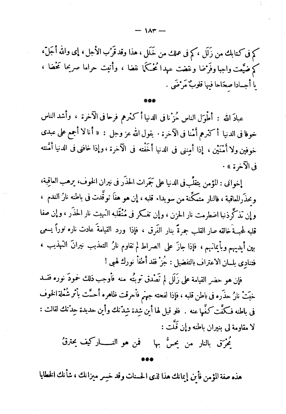 | كم في كتابك من زلل ، كم في عملك من خلل ، هذا وقد قرب الأجل ، إي والله أجل ، | كم ضيعت واجبا وفرضا ونقضت عهدا محكما نقضا ، وأتيت حراما صريحا محضا ، | يا أجسادا صحاحا فيها قلوب مرضى . | | عباد الله : أطول الناس حزنا في الدنيا أكثرهم فرحا في الآخرة ، وأشد الناس | خوفا في الدنيا أكثرهم أمنا في الآخرة . يقول الله عز وجل : ' أنا لا أجمع على عبدي | خوفين ولا أمنين ، إذا أمنني في الدنيا أخفته في الآخرة ، وإذا خافني في الدنيا أمنته | في الآخرة ' . | | إخواني : المؤمن يتقلب في الدنيا على جمرات الحذر في نيران الخوف ، يرهب العاقبة ، | ويحذر المعاقبة ، فالنار متمكنة من سويداء قلبه ، إن هو هفا توقدت في باطنه نار الندم ، | وإن تذكر ذنبا اضطرمت نار الحزن ، وإن تفكر في منقلبه التهبت نار الحذر ، وإن صفا | قلبه لمحبة خالقه صار القلب جمرة بنار الفرق ، فإذا ورد القيامة عادت ناره نورا يسعى | بين أيديهم وبأيمانهم ، فإذا جاز على الصراط لم تقاوم نار التعذيب نيران التهذيب ، | فتنادى بلسان الاعتراف بالتفضيل : جز فقد أطفأ نورك لهبي ! | | فإن هو حضر القيامة على زلل لم تصدق توبته منه فأوجب ذلك خمود نوره فقد | خبت نار حذره في باطن قلبه ، فإذا لفحته جهنم فأحرقت ظاهره أحست بأثر شعلة الخوف | في باطنه فكفت كفها عنه . فلو قيل لها أين شدة شدتك وأين حديدة حدتك لقالت : | لا مقاومة لي بنيران باطنه وإن قلت : | | ( يحرق بالنار من يحس بها % فمن هو النار كيف يحترق ) % | | هذه صفة المؤمن فأين إيمانك هذا لذي الحسنات وقد خسر ميزانك ، شأنك الخطايا |