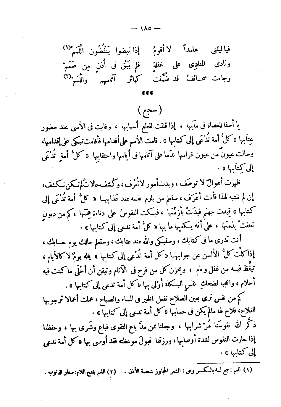 | | ( فيا ليتني هامدا لا أقوم % إذا نهضوا ينفضون اللمم ) % | | ( ونادى المنادي على غفلة % فلم يبق في أذن من صمم ) % | | ( وجاءت صحائف قد ضمنت % كبائر آثامهم واللمم ) % | ( سجع ) | | يا أسفا للعصاة في مآبها ، إذا قلقت لقطع أسبابها ، وغابت في الأسى عند حضور | عتابها ! 2 < كل أمة تدعى إلى كتابها > 2 ! . قامت الأمم على أقدامها فأقامت تبكي على إقدامها ، | وسالت عيون من عيون غرامها ندما على آثامها في أيامها واحتقابها ! 2 < كل أمة تدعى إلى كتابها > 2 ! . | | ظهرت أهوال لا توصف ، وبدت أمور لا تعرف ، وكشف حالات لم تكن تكشف ، | إن لم تنتبه لهذا فأنت أعرف ، ستعلم من يلوم نفسه عند عذابها ! 2 < كل أمة تدعى إلى كتابها > 2 ! قيدت جهنم فبدت بأزمتها ، فبكت النفوس على دناءة همتها ، كم من ديون | تعلقت بذمتها ، على أنه يكفيها ما بها ! 2 < كل أمة تدعى إلى كتابها > 2 ! . | | أنت تدري ما في كتابك ، وستبكي والله عند عتابك ، وستعلم حالك يوم حسابك ، | إذا كلت كل الألسن عن جوابها ! 2 < كل أمة تدعى إلى كتابها > 2 ! يا له يوم لا كالأيام ، | تيقظ فيه من غفل ونام ، ويحزن كل من فرح في الآثام وتيقن أن أحلى ما كنت فيه | أحلام ، واعجبا لضحك نفس البكاء أولى بها ! 2 < كل أمة تدعى إلى كتابها > 2 ! . | | كم من نفس ترى بعين الصلاح تفعل الخير في المساء والصباح ، عملت أعمالا ترجو بها | الفلاح ، فلاح لها ما لم يكن في حسابها ! 2 < كل أمة تدعى إلى كتابها > 2 ! . | | ذكر الله نفوسنا مر شرابها ، وجعلنا ممن مد باع التقوى فباع وشرى بها ، وحفظنا | إذا حارت النفوس لشدة أوصابها ، ورزقنا قبول موعظته فقد أوصى بها ! 2 < كل أمة تدعى إلى كتابها > 2 ! . |