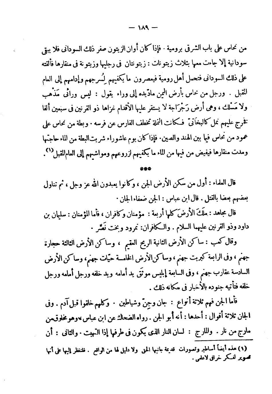 | من نحاس على باب الشرقي برومية . فإذا كان أوان الزيتون صفر ذلك السوداني فلا يبقى | سودانية إلا جاءت معها بثلاث زيتونات : زيتونتان في رجليها وزيتونة في منقارها فألقته | على ذلك السوداني فتحمل أهل رومية فيعصرون ما يكفيهم لسرجهم وإدامهم إلى العام | المقبل . ورجل من نحاس بأرض اليمن ماد يده إلى وراء يقول : ليس ورائي مذهب | ولا مسلك ، وهي أرض رجراجة لا يستقر عليها الأقدام غزاها ذو القرنين في سبعين ألفا | فخرج عليهم نمل كالبخاتي فكانت النملة تخطف الفارس عن فرسه . وبطة من نحاس على | عمود من نحاس فيما بين الهند والصين . فإذا كان يوم عاشوراء شربت البطة من الماء حاجتها | ومدت منقارها فيفيض من فيها من الماء ما يكفيهم لزروعهم ومواشيهم إلى العام المقبل . | | قال العلماء : أول من سكن الأرض الجن ، وكانوا يعبدون الله عز وجل ، ثم تناول | بعضهم بعضا بالقتل . قال ابن عباس : الجن ضعفاء الجان . | | قال مجاهد : ملك الأرض كلها أربعة : مؤمنان وكافران ، فأما المؤمنان : سليمان بن | داود وذو القرنين عليهما السلام . والكافران : نمرود وبخت نصر . | | وقال كعب : ساكن الأرض الثانية الريح العقيم ، وساكن الأرض الثالثة حجارة | جهنم ، وفي الرابعة كبريت جهنم ، وساكن الأرض الخامسة حيات جهنم ، وساكن الأرض | السادسة عقارب جهنم ، وفي السابعة إبليس موثق يد أمامه ويد خلفه ورجل أمامه ورجل | خلفه فتأتيه جنوده بالأخبار في مكانه ذلك . | | فأما الجن فهم ثلاثة أنواع : جان وجن وشياطين . وكلهم خلقوا قبل آدم . وفي | الجان ثلاثة أقوال : أحدها : أنه أبو الجن . رواه الضحاك عن ابن عباس ، وهو مخلوق من | مارج من نار . والمارج : لسان النار الذي يكون في طرفها إذا التهبت . والثاني : أن |