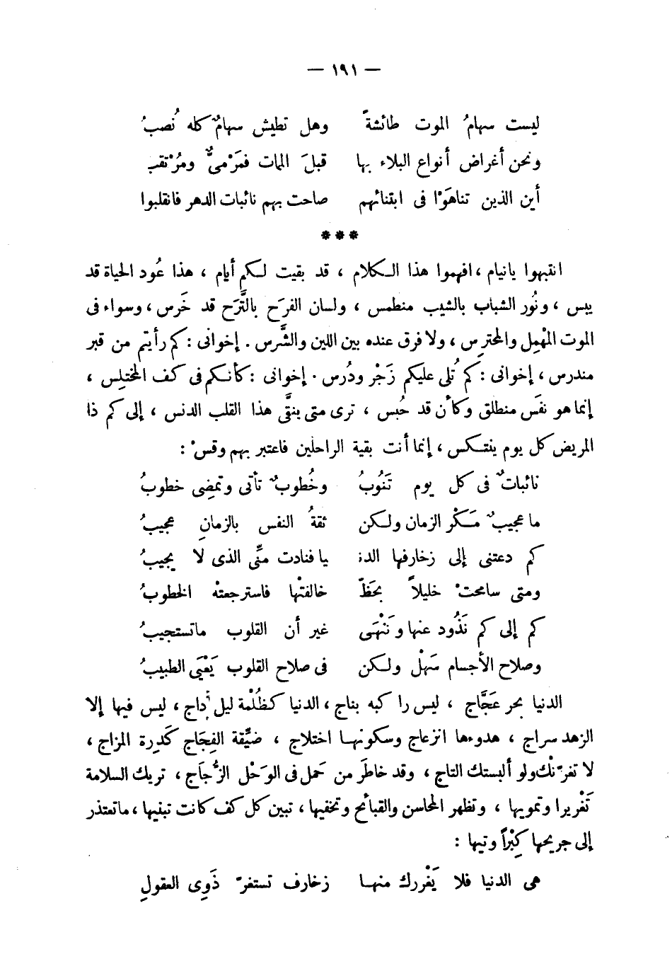 | | ( ليست سهام الموت طائشة % وهل تطيش سهام كله نصب ) % | | ( ونحن أغراض أنواع البلاء بها % قبل الممات فمرمى ومرتقب ) % | | ( أين الذين تناهوا في ابتنائهم % صاحت بهم نائبات الدهر فانقلبوا ) % | | انتبهوا يا نيام ، افهموا هذا الكلام ، قد بقيت لكم أيام ، هذا عود الحياة قد | يبس ، ونور الشباب بالشيب منطمس ، ولسان الفرح بالترح قد خرس ، وسواء في | الموت المهمل والمحترس ، ولا فرق عنده بين اللين والشرس . إخواني : كم رأيتم من قبر | مندرس ، إخواني : كم تلي عليكم زجر ودرس . إخواني : كأنكم في كف المختلس ، | إنما هو نفس منطلق وكأن قد حبس ، ترى متى ينقى هذا القلب الدنس ، إلى كم ذا | المريض كل يوم ينتكس ، إنما أنت بقية الراحلين فاعتبر بهم وقس : | | ( نائبات في كل يوم تنوب % وخطوب تأتي وتمضي خطوب ) % | | ( ما عجيب مكر الزمان ولكن % ثقة النفس بالزمان عجيب ) % | | ( كم دعتني إلى زخارفها الدنيا % فنادت مني الذي لا يجيب ) % | | ( ومتى سامحت خليلا بحظ % خالفتها فاسترجعته الخطوب ) % | | ( كم إلى كم نذود عنها وننهى % غير أن القلوب ما تستجيب ) % | | ( وصلاح الأجسام سهل ولكن % في صلاح القلوب يعيي الطبيب ) % | | الدنيا بحر عجاج ، ليس راكبه بناج ، الدنيا كظلمة ليل داج ، ليس فيها إلا | الزهد سراج ، هدوءها انزعاج وسكونها اختلاج ، ضيقة الفجاج كدرة المزاج ، | لا تغرنك ولو ألبستك التاج ، وقد خاطر من حمل في الوحل الزجاج ، تريك السلامة | تغريرا وتمويها ، وتظهر المحاسن والقبائح وتخفيها ، تبين كل كف كانت تبنيها ، ما تعتذر | إلى جريحها كبرا وتيها : | | ( هي الدنيا فلا يغررك منها % زخارف تستغر ذوي العقول ) % |