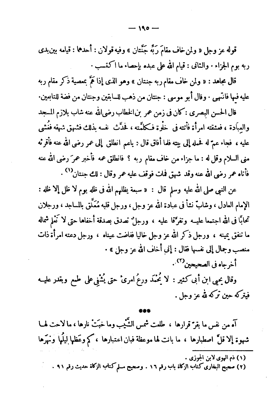 | | قوله عز وجل ! 2 < ولمن خاف مقام ربه جنتان > 2 ! وفيه قولان : أحدهما : قيامه بين يدي | ربه يوم الجزاء . والثاني : قيام الله على عبده بإحصاء ما اكتسب . | | قال مجاهد : ! 2 < ولمن خاف مقام ربه جنتان > 2 ! وهو الذي إذا هم بمعصية ذكر مقام ربه | عليه فيها فانتهى . وقال أبو موسى : جنتان من ذهب للسابقين وجنتان من فضة للتابعين . | | قال الحسن البصري : كان في زمن عمر بن الخطاب رضي الله عنه شاب يلازم المسجد | والعبادة ، فعشقته امرأة فأتته في خلوة فكلمته ، فحدث نفسه بذلك فشهق شهقة فغشي | عليه ، فجاء عم له فحمله إلى بيته فلما أفاق قال : يا عم انطلق إلى عمر رضي الله عنه فأقرئه | مني السلام وقل له : ما جزاء من خاف مقام ربه ؟ فانطلق عمر فأخبر عمر رضي الله عنه | فأتاه عمر رضي الله عنه وقد شهق فمات فوقف عليه عمر وقال : لك جنتان . | | عن النبي صلى الله عليه وسلم قال : ' سبعة يظلهم الله في ظله يوم لا ظل إلا ظله : | الإمام العادل ، وشاب نشأ في عبادة الله عز وجل ، ورجل قلبه معلق بالمساجد ، ورجلان | تحابا في الله اجتمعا عليه وتفرقا عليه ، ورجل تصدق بصدقة أخفاها حتى لا تعلم شماله | ما تنفق يمينه ، ورجل ذكر الله عز وجل خالياً ففاضت عيناه ، ورجل دعته امرأة ذات | منصب وجمال إلى نفسها فقال : إني أخاف الله عز وجل ' . | | أخرجاه في الصحيحين . | | وقال يحيى ابن أبي كثير : لا يحمد ورع امرىء حتى يشفي على طمع ويقدر عليه | فيتركه حين تركه لله عز وجل . | | آه من نفس ما يقر قرارها ، طلعت شمس الشيب وما خبت نارها ، ما لاحت لها | شهوة إلا قل اصطبارها ، ما بانت لها موعظة فبان اعتبارها ، كم وعظها ليلها ونهرها |
