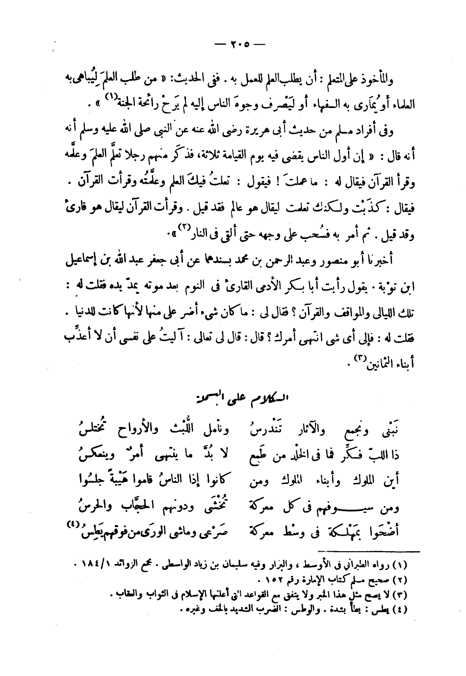 | | والمأخوذ على العلم : أن يطلب العلم للعمل به . ففي الحديث ' من طلب العلم ليباهي به | العلماء أو يماري به السفهاء أو ليصرف وجوه الناس إليه لم يرح رائحة الجنة ' . | | وفي أفراد مسلم من حديث أبي هريرة رضي الله عنه عن النبي صلى الله عليه وسلم أنه | أنه قال : ' إن أول الناس يقضي فيه يوم القيامة ثلاثة ، فذكر منهم وجلا تعلم العلم وعلمهه | وقرأ القرآن فيقال له : ما عملت ! فيقول : تعلت فيك العلم وعلمته وقرأت القرآن . | فيقال : كذبت ولكنك تعلمت ليقال هو عالم فقد قيل . وقرأت القرآن ليقال هو قارئ | وقد قيل . ثم أمر به فسحب على وجهه حتى ألقي في النار ' . | | أخبرنا أبو منصور وعبد الرحمن بن محمد بسندهما عن أبي جعفر عبد الله بن إسماعيل | ابن توبة . يقول : رأيت أبا بكر الأدمي القارئ في النوم بعد موته يمد يده فقلت له : | تلك الليالي والمواقف والقرآن ؟ فقاليلي : ما كان شيء أضر على منها لأنها كانت للدنيا . | فقلت له : فإلى اي شيء انتهى أمرك ؟ قال : قال لي تعالى : آليت على نفسي أن لا أعذب | أبناء الثمانين . | الكلام على البسملة | | ( تبنى وتجمع والآثار تندرس % ونأمل اللبث والأرواح تختلس ) % | | ( ذا اللب فكر فما في الخلد من طبع % لا بد ما بنتهى أمر وينعكس ) % | | ( أين الملوك وابناء الملوك ومن % كانوا إذا الناس قاموا هيبة جلسوا ) % | | ( ومن سيوفهم في كل معركة % تخشى ودونهم الحجاب والحرس ) % | | ( أضحوا بمهلكة في وسط معركة % صرعي وماشي الورى من فوقهم يطس ) % |
