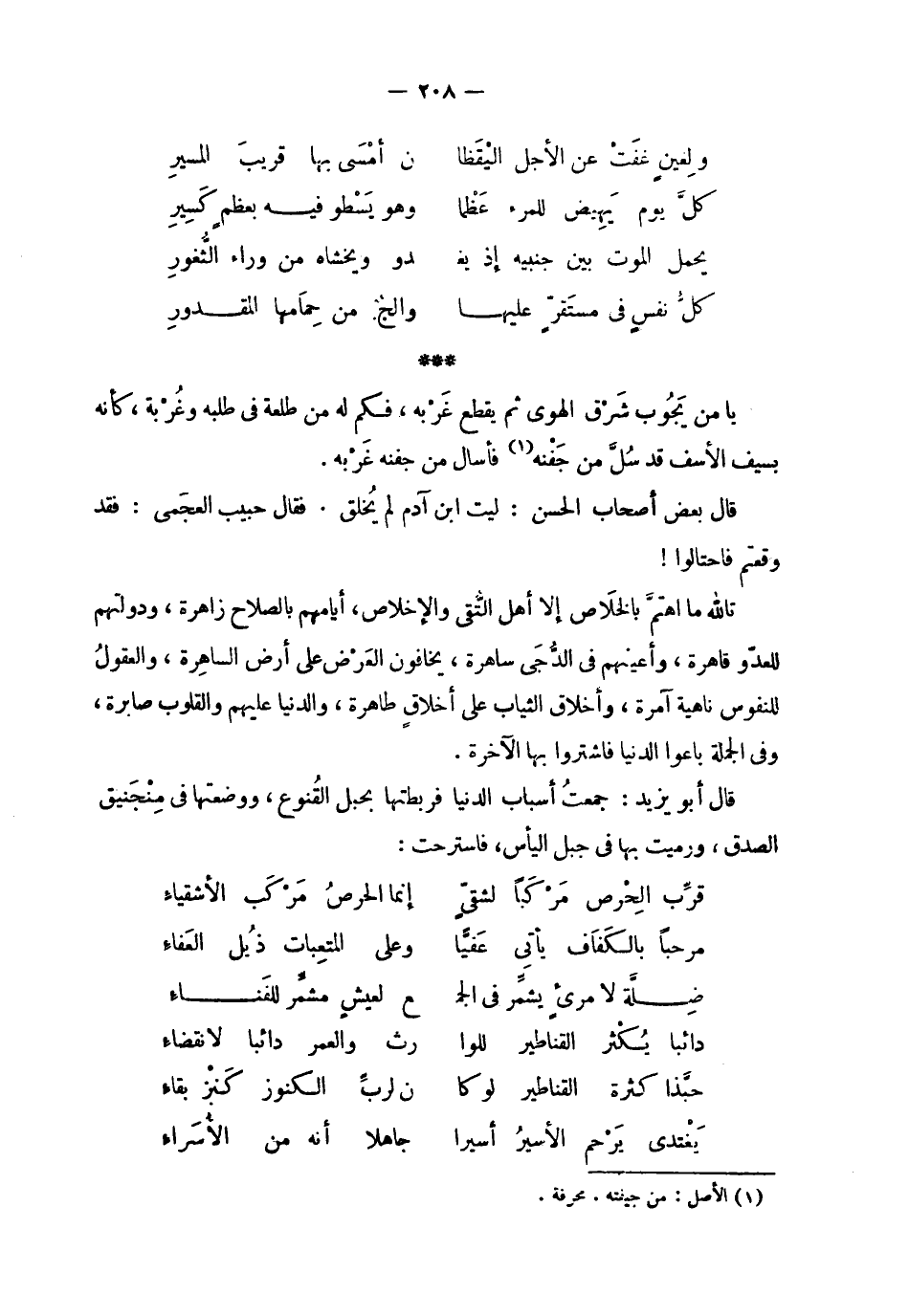 | | ( ولعين غفت عن الأجل اليقظان % أمسى بها قريب المسير ) % | | ( كل يوم يهيض للمرء عظما % وهو يسطو فيه بعظم كسير ) % | | ( يحمل الموت بين جنبيه إذ يغدو % ويخشاه من وراء الثغور ) % | | ( كل نفس في مستقر عليها % والج من حمامها المقدور ) % | | يا من يجوب شرق الهوى ثم يقطع غربه ، فكم له من طلعة في طلبه وغربة ، كأنه | بسيف الأسف قد سل من جفنه فأسال من جفنه غربه . | | قال بعض أصحاب الحسن : ليت ابن آدم لم يخلق . فقال حبيب العجمي : فقد | وقعتم فاحتالوا ! | | تالله ما اهتم بالخلاص إلا أهل التقى والإخلاص ، أيامهم بالصلاح زاهرة ، ودولتهم | للعدو قاهرة ، وأعينهم في الدجى ساهرة ، يخافون العرض على أرض الساهرة ، والعقول | للنفوس ناهية آمرة ، وأخلاق الثياب على أخلاق طاهرة ، والدنيا عليهم والقلوب صابرة ، | وفي الجملة باعوا الدنيا فاشتروا بها الآخرة . | | قال أبو يزيد : جمعت أسباب الدنيا فربطتها بحبل القنوع ، ووضعتها في منجنيق | الصدق ، ورميت بها في جبل اليأس ، فاسترحت : | | ( قرب الحرص مركبا لشقي % إنما الحرص مركب الأشقياء ) % | | ( مرحبا بالكفاف يأتى عفيا % وعلى المتعبات ذيل العفاء ) % | | ( ضلة لامرئ يشمر في الجمع % لعيش مشمر للفناء ) % | | ( دائبا يكثر القناطير للوارث % والعمر دائبا لانقضاء ) % | | ( حبذا كثرة القناطير لو كان % لرب الكنوز كنز بقاء ) % | | ( يغتدى يرحم الأسير أسيرا % جاهلا أنه من الأسراء ) % |