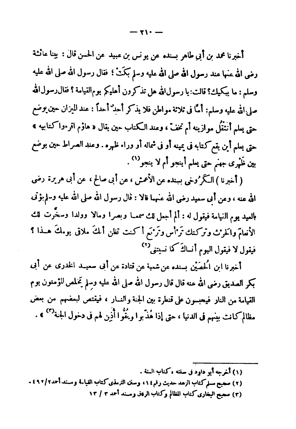 | | أخبرنا محمد بن أبي طاهر بسنده عن يونس بن عبيد عن الحسن قال : بينا عائشة | رضي الله عنها عند رسول الله صلى الله عليه وسلم بكت ؛ فقال رسول الله صلى الله عليه وسلم : | ما يبكيك ؟ قالت : يا رسول الله هل تذكرون أهليكم يوم القيامة ؟ فقال رسول الله | صلى الله عليه وسلم : أما في ثلاثة مواطن فلا يذكر أحد أحداً : عند الميزان حين يوضع | حتى يعلم أتثقل موازينه أم تخف ، وعند الكتاب حين يقال ^ ( هاؤم اقرءوا كتابيه ) ^ | حتى يعلم أين يقع كتابه في يمينه أو في شماله أو وراء ظهره . وعند الصراط حين يوضع | بين ظهري جهنم حتى يعلم أينجو أم لا ينجو . | | ( أخبرنا ) الكروخي بسنده عن الأعمش ، عن أبي صالح ، عن أبي هريرة رضي | الله عنه ، وعن أبي سعيد رضي الله عنهما قالا : قال رسول الله صلى الله عليه وسلم يؤتى | بالعبد يوم القيامة فيقول له : ألم أجعل لك سمعا وبصرا ومالا وولدا وسخرت لك | الانعام والحرث وتركتك ترأس وترتع أكنت تظن أنك ملاقي يومك هذا ؟ | فيقول لا فيقول اليوم أنساك كما نسيتني . | | أخبرنا ابن الحصين بسنده عن شعبة عن قتادة عن أبي سعيد الخدري عن أبي | بكر الصديق رضي الله عنه قال : قال رسول الله صلى الله عليه وسلم يخلص المؤمنون يوم | القيامة من النار فيحبسون على قنطرة بين الجنة والنار ، فيقتص لبعضهم من بعض | مظالم كانت بينهم في الدنيا ، حتى إذا هذبوا ويقوا أذن لهم في دخول الجنة ' . |