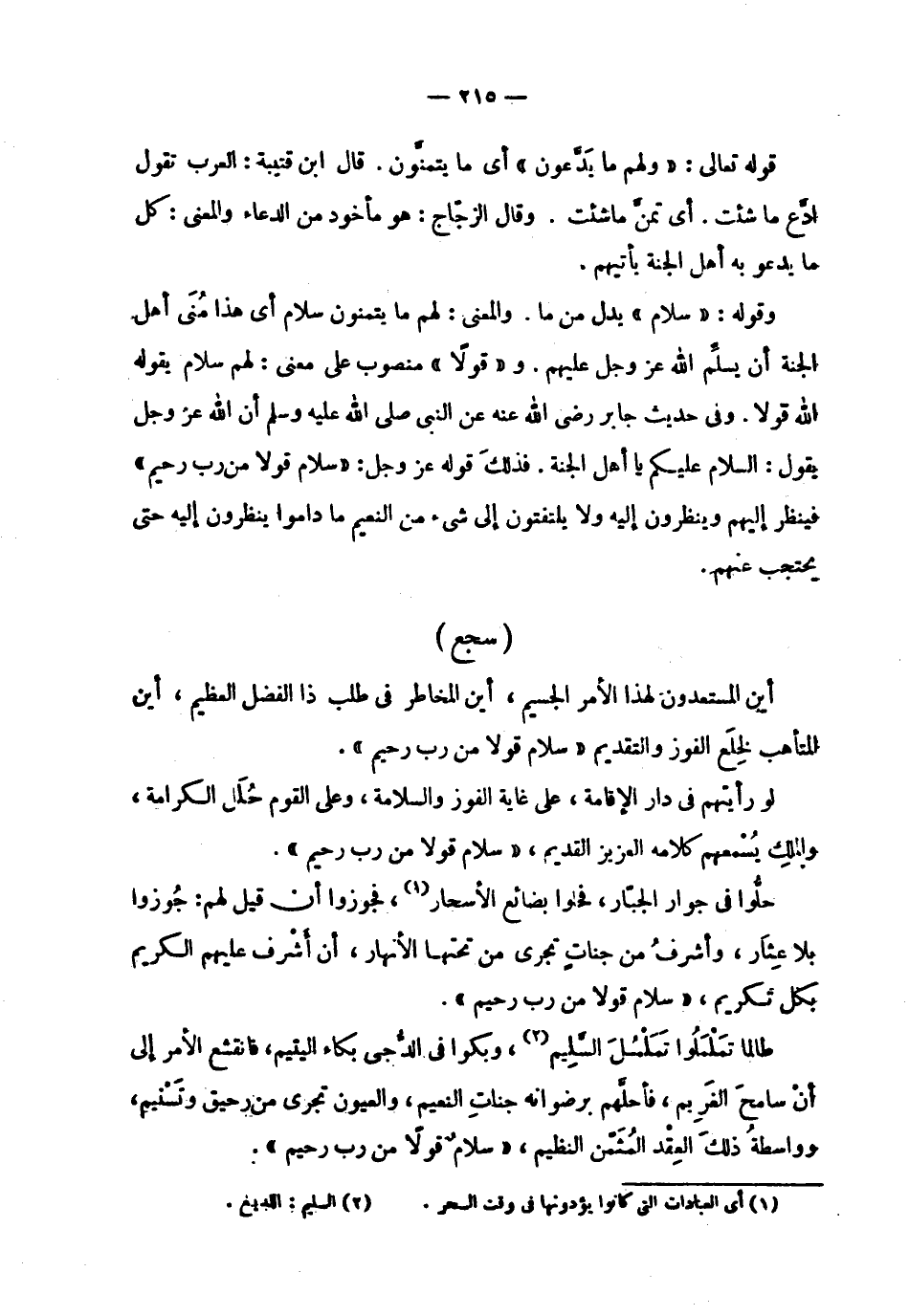 | | قوله تعالى : ! 2 < ولهم ما يدعون > 2 ! أي ما يتمنون . قال ابن قتيبة : العرب تقول | ادع ما شئت . أي تمن ما شئت . وقال الزجاج : هو مأخوذ من الدعاء والمعنى : كل | ما يدعو به أهل الجنة يأتيهم . | | وقوله : ! 2 < سلام > 2 ! يدل من ما . والمعنى : لهم ما يتمنون سلام أي هذا منى أهل | الجنة أن يسلم الله عز وجل عليهم . و ! 2 < قولا > 2 ! منصوب على معنى : لهم سلام يقوله | الله قولا . وفي حديث جابر رضي الله عنه عن النبي صلى الله عليه وسلم أن الله عز وجل | يقول : السلام عليكم يا أهل الجنة . فذلك قوله عز وجل : ! 2 < سلام قولا من رب رحيم > 2 ! | فينظر إليهم وينظرون إليه ولا يلتفتون إلى شيء من النعيم ما داموا ينظرون إليه حتى | يحتجب عنهم . | ( سجع ) | | أين المستعدون لهذا الأمر الجسيم ، أين المخاطر في طلب ذا الفضل العظيم ، أين | المتأهب لخلع الفوز والتقديم ! 2 < سلام قولا من رب رحيم > 2 ! . | | لو رأيتهم في دار الإقامة ، على غاية الفوز والسلامة ، وعلى القوم حلل الكرامة ، | والملك يسمعهم كلامه العزيز القديم ، ! 2 < سلام قولا من رب رحيم > 2 ! . | | حلوا في جوار الجبار ، فحلوا بضائع الأسحار ، فجوزوا أن قيل لهم : جوزوا | بلا عثار ، وأشرف من جنات تجري من تحتها الأنهار ، أن أشرف عليهم الكريم | بكل تكريم ، ! 2 < سلام قولا من رب رحيم > 2 ! . | | طالموا تململوا تململ السليم ، وبكوا في الدجى بكاء اليتيم ، فانقشع الأمر إلى | أن سامح الغريم ، فأحلهم برضوانه جنات النعيم ، والعيون تجري من رحيق وتسنيم ، | وواسطة ذلك العقد المثمن النظيم ، ! 2 < سلام قولا من رب رحيم > 2 ! . |