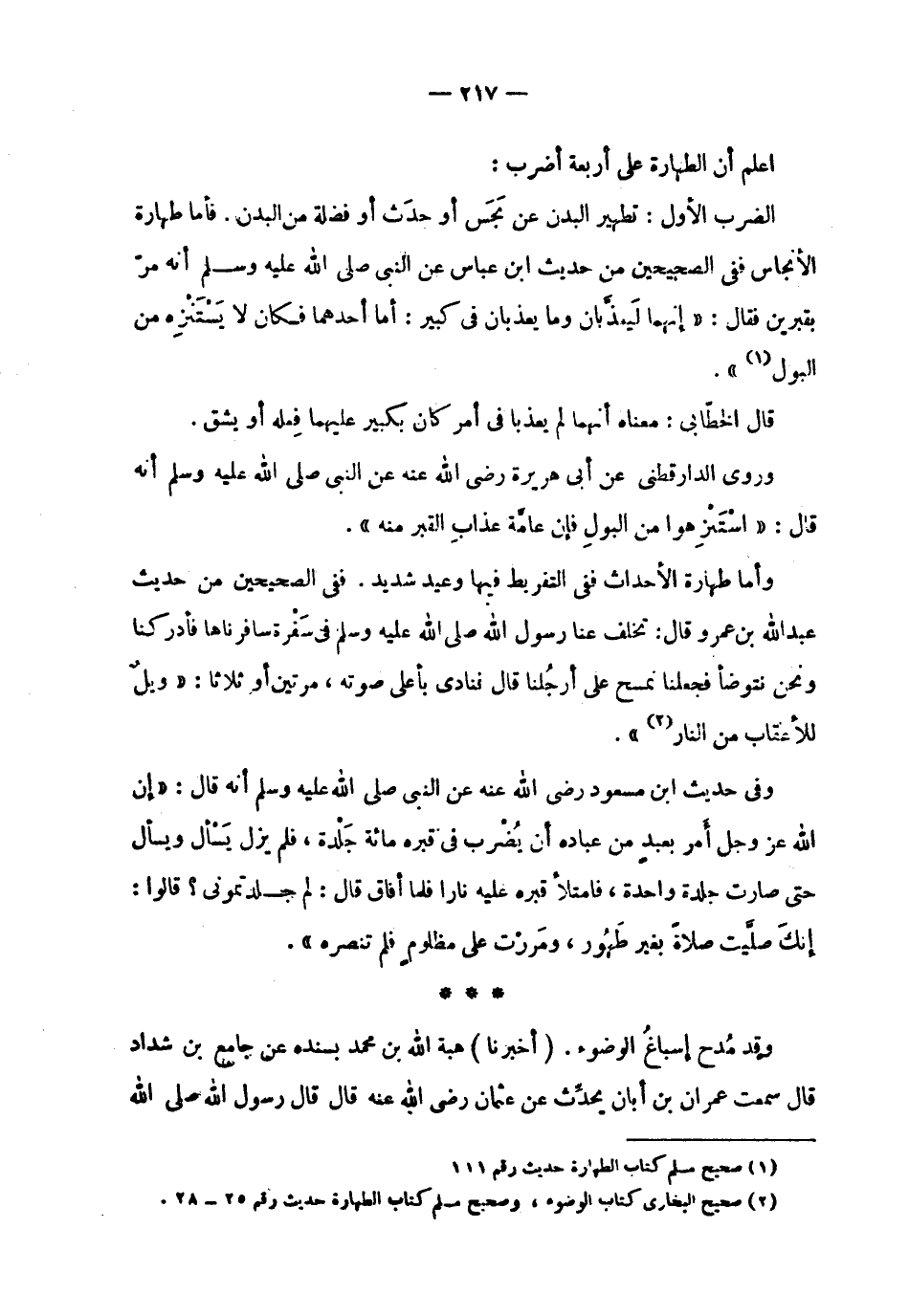 | | اعلم أن الطهارة على أربعة أضرب : | | الضرب الأول : تطهير البدن عن نجس أو حدث أو فضلة من البدن . فأما طهارة | الأنجاس ففي الصحيحين من حديث ابن عباس عن النبي صلى الله عليه وسلم أنه مر | بقبرين فقال : ' إنهما ليعذبان وما يعذبان في كبير : أما أحدهما فكان لا يستنزه من | البول ' . | | قال الخطابي : معناه أنهما لم يعذبا في أمر كان بكبير عليهما فعله أو يشق . | | وروى الدارقطني عن أبي هريرة رضي الله عنه عن النبي صلى الله عليه وسلم أنه | قال : ' استنزهوا من البول فإن عامة عذاب القبر منه ' . | | وأما طهارة الأحداث ففي التفريط فيها وعيد شديد . ففي الصحيحين من حديث | عبد الله بن عمرو قال : تخلف عنا رسول الله صلى الله عليه وسلم في سفرة سافرناها فأدركنا | ونحن نتوضأ فجعلنا نمسح على أرجلنا قال فنادى بأعلى صوته ، مرتين أو ثلاثا : ' ويل | للأعقاب من النار ' . | | وفي حديث ابن مسعود رضي الله عنه عن النبي صلى الله عليه وسلم أنه قال : ' إن | الله عز وجل أمر بعبد من عباده أن يضرب في قبره مائة جلدة ، فلم يزل يسأل ويسأل | حتى صارت جلدة واحدة ، فامتلأ قبره عليه نارا فلما أفاق قال : لم جلدتموني ؟ قالوا : | إنك صليت صلاة بغير طهور ، ومررت على مظلوم فلم تنصره ' . | | وقد مدح إسباغ الوضوء . ( أخبرنا ) هبة الله بن محمد بسنده عن جامع بن شداد | قال سمعت عمران بن أبان يحدث عن عثمان رضي الله عنه قال قال رسول الله صلى الله عليه وسلم : |
