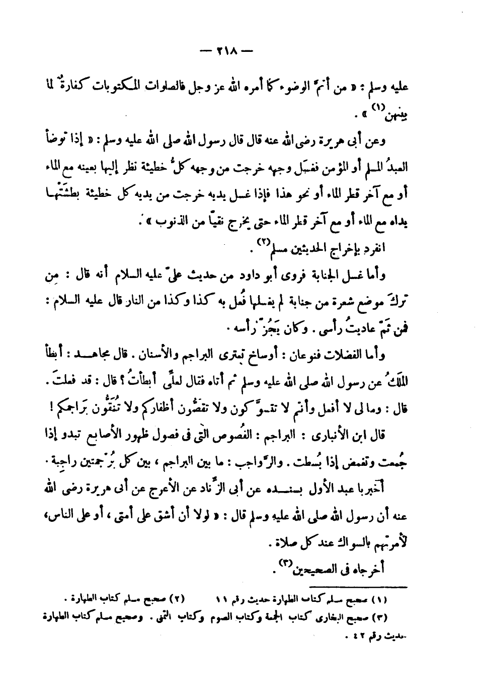 | ' من أتم الوضوء كما أمره الله عز وجل فالصلوات المكتوبات كفارة لما | بينهن ' . | | وعن أبي هريرة رضي الله عنه قال قال رسول الله صلى الله عليه وسلم : ' إذا توضأ | العبد المسلم أو المؤمن فغسل وجهه خرجت من وجهه كل خطيئة نظر إليها بعينه مع الماء | أو مع آخر قطر الماء أو نحو هذا فإذا غسل يديه خرجت من يديه كل خطيئة بطشتها | يداه مع الماء أو مع آخر قطر الماء حتى يخرج نقيا من الذنوب ' . | | انفرد بإخراج الحديثين مسلم . | | وأما غسل الجنابة فروى أبو داود من حديث علي عليه السلام أنه قال : من | ترك موضع شعرة من جنابة لم يغسلها فعل به كذا وكذا من النار قال عليه السلام : | فمن ثم عاديت رأسي . وكان يجز رأسه . | | وأما الفضلات فنوعان : أوساخ تعتري البراجم والأسنان . قال مجاهد : أبطأ | الملك عن رسول الله صلى الله عليه وسلم ثم أتاه فقال لعلي أبطأت ؟ قال : قد فعلت . | قال : وما لي لا أفعل وأنتم لا تتسوكون ولا تقصون أظفاركم ولا تنقون براجمكم ! | | قال ابن الأنباري : البراجم : الفصوص التي في فصول ظهور الأصابع تبدو إذا | جمعت وتغمض إذا بسطت . والرواجب : ما بين البراجم ، بين كل برجمتين راجبة . | | أخبرنا عبد الأول بسنده عن أبي الزناد عن الأعرج عن أبي هريرة رضي الله عنه | أن رسول الله صلى الله عليه وسلم قال : ' لولا أن أشق على أمتي ، أو على الناس ، | لأمرتهم بالسواك عند كل صلاة . | | أخرجاه في الصحيحين . |