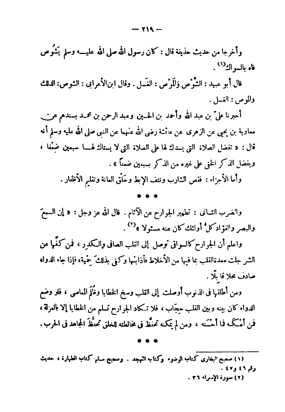 | | وأخرجا من حديث حذيفة قال : كان رسول الله صلى الله عليه وسلم يشوص | فاه بالسواك . | | قال أبو عبيد : الشوص والموص : الغسل . وقال ابن الأعرابي : الشوص : الدلك | والموص : الغسل . | | أخبرنا علي بن عبد الله وأحمد بن الحسين وعبد الرحمن بن محمد بسندهم عن | معاوية بن يحيى عن الزهري عن عائشة رضي الله عنهما عن النبي صلى الله عليه وسلم أنه | قال : ' تفضل الصلاة التي يستاك لها على الصلاة التي لا يستاك لها سبعين ضعفا ، | ويفضل الذكر الخفي على غيره من الذكر بسبعين ضعفا ' . | | وأما الأجزاء : فقص الشارب ونتف الإبط وحلق العانة وتقليم الأظافر . | | والضرب الثاني : تطهير الجوارح عن الآثام . قال الله عز وجل : ^ ( إن السمع | والبصر والفؤاد كل أولئك كان عنه مسئولا ) ^ . | | واعلم أن الجوارح كالسواقي توصل إلى القلب الصافي والكدر ، فمن كفها عن | الشر جلت معدة القلب بما فيها من الأخلاط فأذابتها وكفى بذلك حمية ، فإذا جاء الدواء | صادف محلا قابلا . | | ومن أطلقها في الذنوب أوصلت إلى القلب وسخ الخطايا وظلم المعاصي ، فلو وضع | الدواء كان بينه وبين القلب حجاب ، فلا تكاد الجوارح تسلم من الخطايا إلا بالعزلة ، | فمن أمكنه فما أحسنه ، ومن لم يمكنه تحفظ في مخالطته للخلق تحفظ المجاهد في الحرب . |