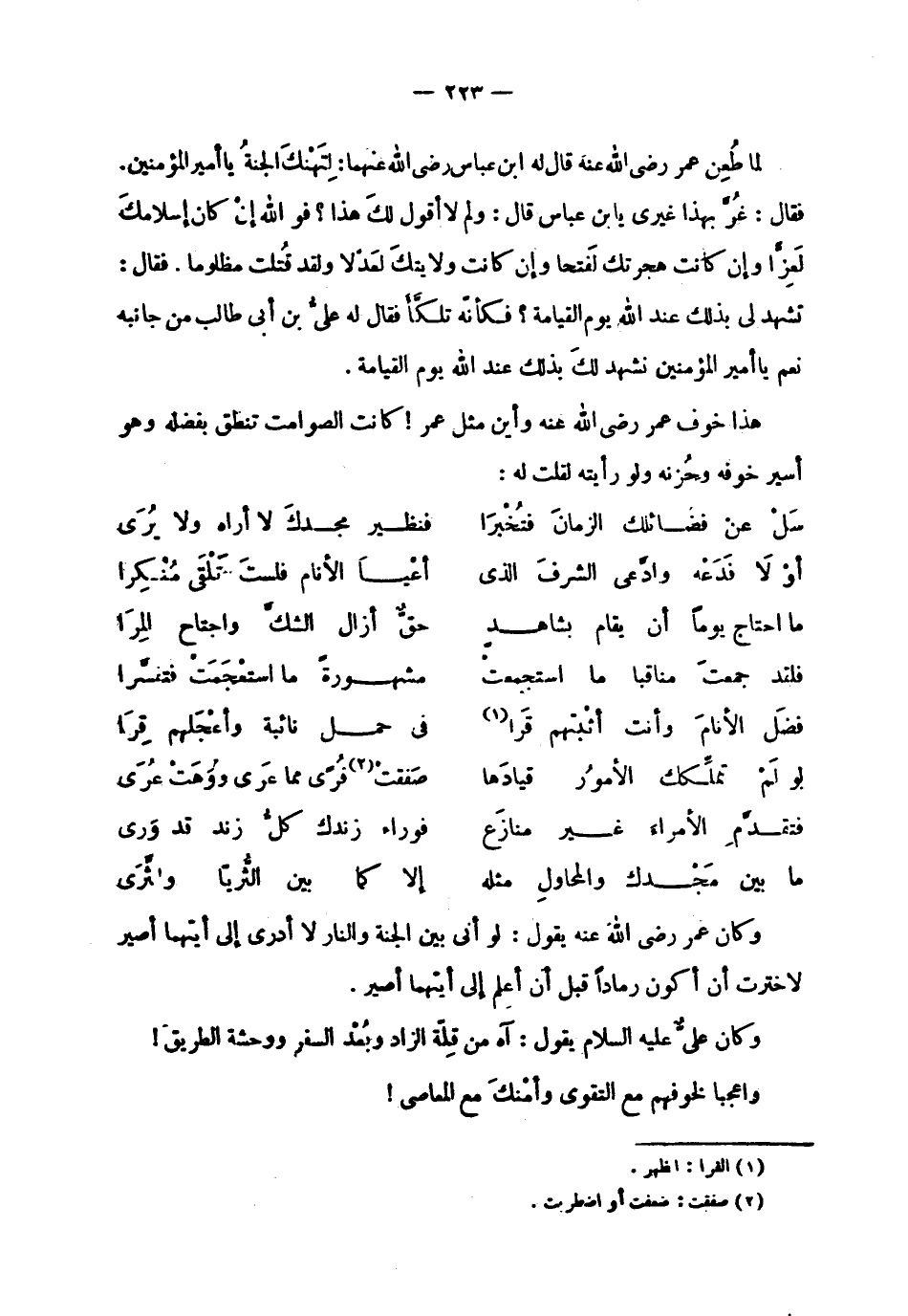 | | لما طعن عمر رضي الله عنه قال له ابن عباس رضي الله عنهما : لتهنك الجنة يا أمير المؤمنين | قال : غر بهذا غيري يا بن عباس : قال : ولم لا أقول لك هذا ؟ فوالله إن كان إسلامك | لعزا وإن كانت هجرتك لفتحا وإن كانت ولايتك لعدلا ولقد قتلت مظلوما . فقال : | تشهد لي بذلك عند الله يوم القيامة ؟ فكأنه تلكأ فقال له علي بن أبي طالب من جانبه | نعم يا أمير المؤمنين نشهد لك بذلك عند الله يوم القيامة | | هذا خوف عمر رضي الله عنه وأين مثل عمر ! كانت الصوامت تنطق بفضله وهو | أسير خوفه وحزنه ولو رأيته لقلت له : | | ( سل عن فضائك الزمان فتخبرا % فنظير مجدك لا أراه ولا يرى ) % | | ( أو لا فدعه وادعي الشرف الذي % أعيا الأنام فلست تلقى منكرا ) % | | ( ما احتاج يوما أن يقام بشاهد % حق أزال الشك واجتاح المرا ) % | | ( فلقد جمعت مناقبا ما استجمعت % مشهورة ما استعجمت فتفسرا ) % | | ( فضل الأنام وأنت أثبتهم قرا % في حمل نائبة وأعجلهم قرا ) % | | ( لو لم تملكك الأمور قيادها % صفقت قرى مما عرى ووهت عرى ) % | | ( فتقدم الأمراء غير منازع % فوراء زندك كل زند قد ورى ) % | | ( ما بين مجدك والمحاول مثله % إلا كما بين الثريا والثرى ) % | | وكان عمر رضي الله عنه يقول : لو أني بين الجنة والنار لا أدري إلى أيتهما أصير | لاخترت أن أكون رمادا قبل أن أعلم إلى أيتهما أصير . | | وكان علي عليه السلام يقول : آه من قلة الزاد وبعد السفر ووحشة الطريق ! | | واعجبا لخوفهم مع التقوى وأمنك مع المعاصي ! |