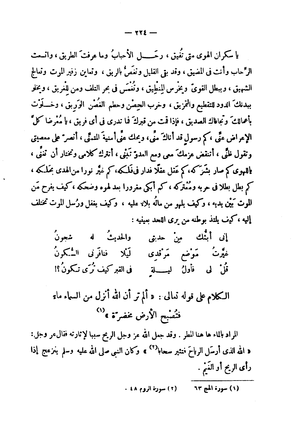 | | يا سكران الهوى متى تفيق ، رحل الأحباب وما عرفت الطريق ، واتسعت | الرحاب وأنت في المضيق ، وقد بقي القليل وتغص بالريق ، وتعاين زفير الموت وتعالج | الشهيق ، ويبطل القوى ويخرس المنطيق ، وتغمس في بحر التلف ومن للغريق ، ويخلو | ببدنك الدود للتقطيع والتمزيق ، وخرب الحصن وحطم الغصن الوريق ، وخلوت | بأعمالك وتجافاك الصديق ، فإذا قمت من قبرك فما تدري في أي فريق ، يا معرضا كل | الإعراض عني ، كم رسول قد أتاك مني ، ويحك عني أمنية المتمني ، أتصر على معصيتي | وتقول ظني ، أتنقض عزمك معي ومع العدو تبني ، أتترك كلامي وتختار أن تغني ، | يال للهوى كم صار بشركه ، كم عقل عقلا فدار في فلكه ، كم غير نورا من الهدى بحلكه ، | كم بطل بطلا في حربه ومعتركه ، كم أبكي مغرورا بعد لهوه وضحكه ، كيف يفرح من | الموت بين يديه ، وكيف يلهو من ماله بلاء عليه ، وكيف يغفل ورسل الموت تختلف | إليه ، كيف يلتذ بوطنه من يرى اللحد بعينيه : | | ( إني أبثك من حديثي % والحديث له شجون ) % | | ( غيرت موضع مرقدي % ليلا فنافرني السكون ) % | | ( قل لي فأول ليلة % في القبر كيف ترى تكون ؟ ! ) % | | الكلام على قوله تعالى ! 2 < ألم تر أن الله أنزل من السماء ماء فتصبح الأرض مخضرة > 2 ! | المراد بالماء ها هنا المطر . وقد جعل الله عز وجل الريح سببا لإثارته فقال عز وجل : | ! 2 < الله الذي أرسل الرياح فتثير سحابا > 2 ! وكان النبي صلى الله عليه وسلم ينزعج إذا | رأى الريح أو الغيم . |