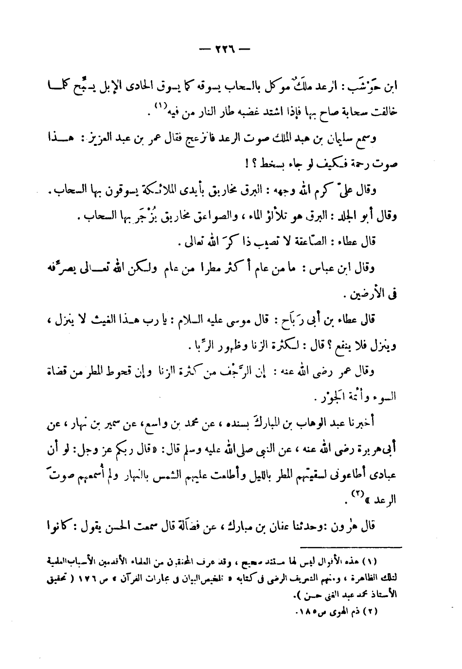 | ابن حوشب : الرعد ملك موكل بالسحاب يسوقه كما يسوق الحادي الإبل يسبح كلما | خالفت سحابة صاح بها فإذا اشتد غضبه طار النار من فيه . | | وسمع سليمان بن عبد الملك صوت الرعد فانزعج فقال عمر بن عبد العزيز : هذا | صوت رحمة فكيف لو جاء بسخط ؟ ! | | وقال علي كرم الله وجهه : البرق مخاريق بأيدي الملائكة يسوقون بها السحاب . | وقال أبو الجلد : البرق هو تلألؤ الماء ، والصواعق مخاريق يزجر بها السحاب . | | قال عطاء : الصاعقة لا تصيب ذاكر الله تعالى . | | وقال ابن عباس : ما من عام أكثر مطرا من عام ولكن الله تعالى يصرفه | في الأرضين . | | قال عطاء بن أبي رباح : قال موسى عليه السلام : يا رب هذا الغيث لا ينزل ، | وينزل فلا ينفع ؟ قال : لكثرة الزنا وظهور الربا . | | وقال عمر رضي الله عنه : إن الرجف من كثرة الزنا وإن قحوط المطر من قضاة | السوء وأئمة الجور . | | أخبرنا عبد الوهاب بن المبارك بسنده ، عن محمد بن واسع ، عن سمير بن نهار ، عن | أبي هريرة رضي الله عنه ، عن النبي صلى الله عليه وسلم قال : ' قال ربكم عز وجل : لو أن | عبادي أطاعوني لسقيتهم المطر بالليل وأطلعت عليهم الشمس بالنهار ولم أسمعهم صوت | الرعد ' . | | قال هارون : وحدثنا عفان بن مبارك ، عن فضالة قال سمعت الحسن يقول : كانوا |