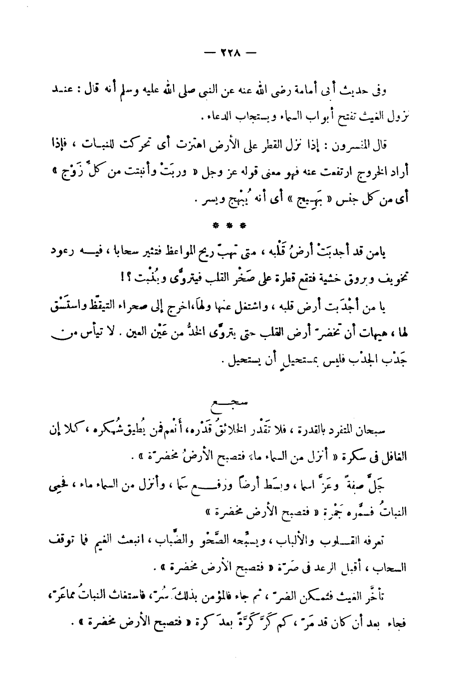 | | وفي حديث أبي أمامة رضي الله عنه عن النبي صلى الله عليه وسلم أنه قال : عند | نزول الغيث تفتح أبواب السماء ويستجاب الدعاء . | | قال المفسرون : إذا نزل القطر على الأرض اهتزت أي تحركت للنبات ، فإذا | أراد الخروج ارتفعت عنه فهو معنى قوله عز وجل ! 2 < وربت وأنبتت من كل زوج > 2 ! | أي من كل جنس ! 2 < بهيج > 2 ! أي أنه يبهج ويسر . | | يا من قد أجدبت أرض قلبه ، متى تهب ريح المواعظ فتثير سحابا ، فيه رعود | تخويف وبروق خشية فتقع قطرة على صخر القلب فيتروى وينبت ؟ ! | | يا من أجدبت أرض قلبه ، واشتغل عنها ولها ، اخرج إلى صحراء التيقظ واستسق | لها ، هيهات أن تخضر أرض القلب حتى يتروى الخد من عين العين . لا تيأس من | جدب الجدب فليس بمستحيل أن يستحيل . | سجع | | سبحان المتفرد بالقدرة ، فلا تقدر الخلائق قدره ، أنعم فمن يطيق شكره ، كلا إن | الغافل في سكرة ! 2 < أنزل من السماء ماء فتصبح الأرض مخضرة > 2 ! . | | جل صفة وعز اسما ، وبسط أرضا ورفع سما ، وأنزل من السماء ماء ، فحمى | النبات فسموه جمرة ! 2 < فتصبح الأرض مخضرة > 2 ! . | | تعرفه القلوب والألباب ، ويسبحه الصحو والضباب ، انبعث الغيم فما توقف | السحاب ، أقبل الرعد في صرة ! 2 < فتصبح الأرض مخضرة > 2 ! . | | تأخر الغيث فتمكن الضر ، ثم جاء فالمؤمن بذلك سر ، فاستغاث النبات مما عر ، | فجاء بعد أن كان قد مر ، كم كر كرة بعد كرة ! 2 < فتصبح الأرض مخضرة > 2 ! . |