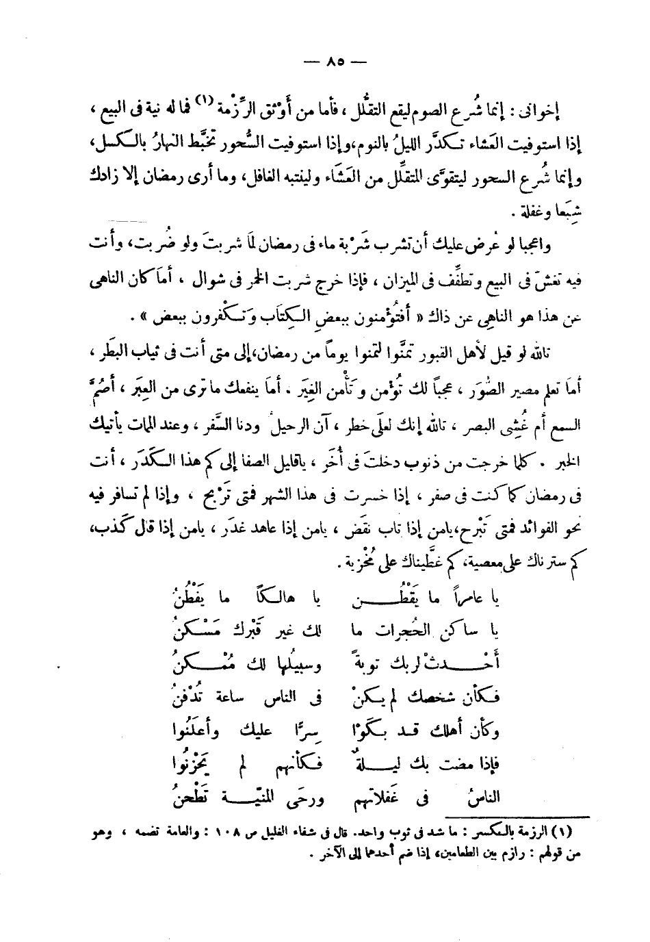 | | إخواني : إنما شرع الصوم ليقع التقلل ، فأما من أوثق الرزمة فما له نية في البيع ، | إذا استوفيت العشاء تكدر الليل بالنوم ، وإذا استوفيت السحور تخبط النهار بالكسل ، | وإنما شرع السحور ليتقوى المتقلل من العشاء ولينتبه الغافل ، وما أرى رمضان إلا زادك | شبعا وغفلة . | | وا عجباً لو عرض عليك أن تشرب شربة ماء في رمضان لما شربت ولو ضربت ، وأنت | فيه تغش في البيع وتطفف في الميزان ، فإذا خرج شربت الخمر في شوال ، أما كان الناهي | عن هذا هو الناهي عن ذاك ! 2 < أفتؤمنون ببعض الكتاب وتكفرون ببعض > 2 ! . | | تالله لو قيل لأهل القبور تمنوا لتمنوا يوماً من رمضان ، إلى متى أنت في ثياب البطر ، | أما تعلم مصير الصور ، عجبا لك تؤمن وتأمن الغير ، أما ينفعك ما ترى من العبر ، أصم | السمع أم غشي البصر ، تالله إنك لعلى خطر ، آن الرحيل ودنا السفر ، وعند الممات يأتيك | الخبر . كلما خرجت من ذنوب دخلت في آخر ، يا قليل الصفا إلى كم هذا الكدر ، أنت | في رمضان كما كنت في صفر ، إذا خسرت في هذا الشهر فمتى تربح ، وإذا لم تسافر فيه | نحو الفوائد فمتى تبرح ، يا من إذا تاب نقض ، يا من إذا عاهد غدر ، يا من إذا قال كذب ، | كم سترناك على معصية ، كم غطيناك على مخزية . | | ( يا عامراً ما يقطن % يا هالكا ما يفطن ) % | | ( يا ساكن الحجرات ما % لك غير قبرك مسكن ) % | | ( أحدث لربك توبة % وسبيلها لك ممكن ) % | | ( فكأن شخصك لم يكن % في الناس ساعة تدفن ) % | | ( وكأن أهلك قد بكوا % سراً عليك وأعلنوا ) % | | ( فإذا مضت بك ليلة % فكأنهم لم يحزنوا ) % | | ( الناس في غفلاتهم % ورحى المنية تطحن ) % |