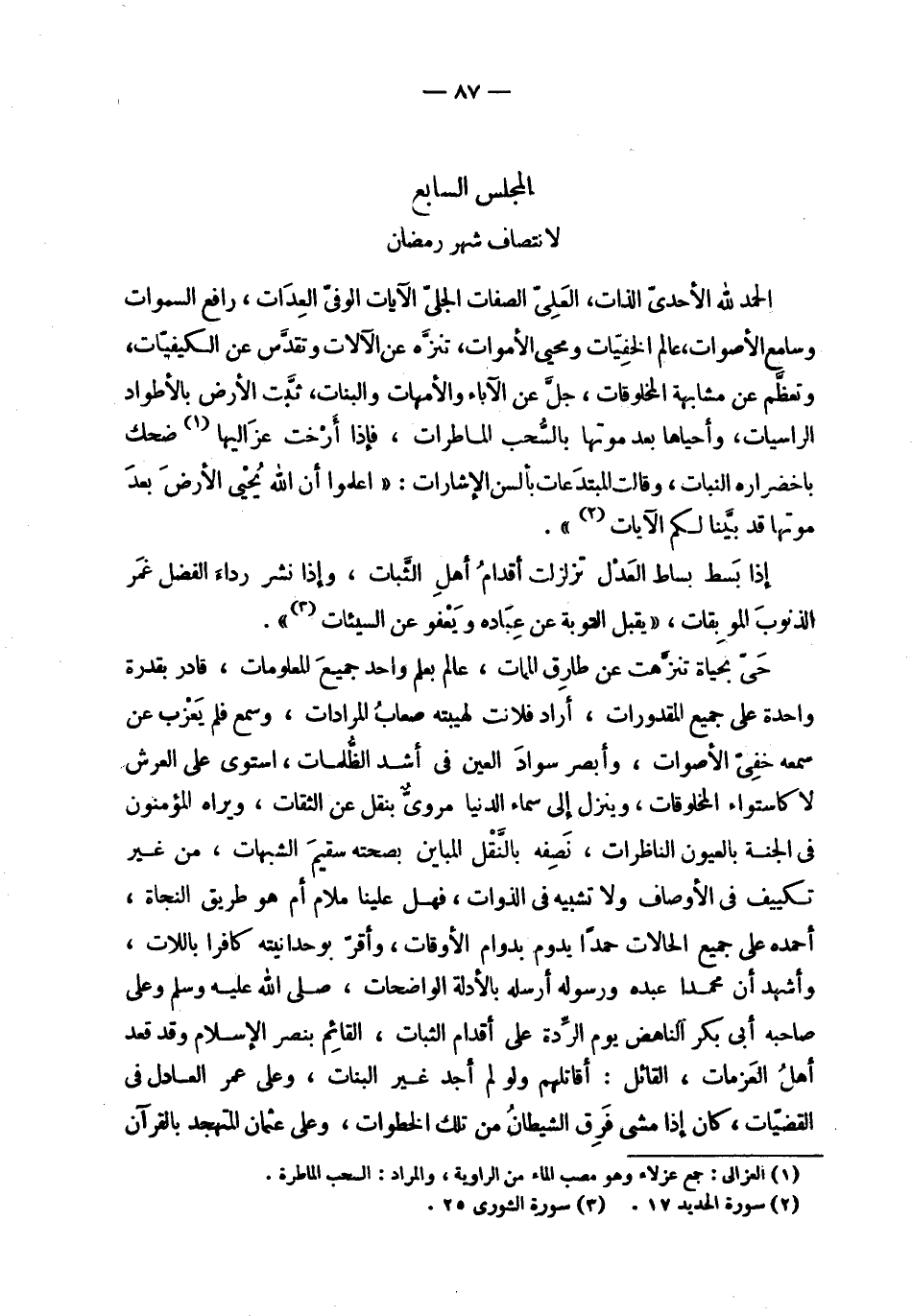 | المجلس السابع | لانتصاف شهر رمضان | الحمد لله الأحدى الذات ، العلي الصفات الجلي الآيات الوفي العدات ، رافع السماوات | وسامع الأصوات ، عالم الخفيات ومحيي الأموات ، تنزه عن الآلات وتقدس عن الكيفيات ، | وتعظم عن مشابهة المخلوقات ، جل عن الآباء والأمهات والبنات ، ثبت الأرض بالأطواد | الراسيات ، وأحياها بعد موتها بالسحب الماطرات ، فإذا أرخت عزاليها ضحك | باخضراره النبات ، وقال المبتدعات بألسن الإشارات : ! 2 < اعلموا أن الله يحيي الأرض بعد موتها قد بينا لكم الآيات > 2 ! . | | إذا بسط بساط العدل تزلزلت أقدام أهل الثبات ، وإذا نشر رداء الفضل غمر | الذنوب الموبقات ، ! 2 < يقبل التوبة عن عباده ويعفو عن السيئات > 2 ! . | | حي بحياة تنزهت عن طارق الممات ، عالم بعلم واحد جميع المعلومات ، قادر بقدرة | واحدة على جميع المقدورات ، أراد فلانت لهيبته صعاب المرادات ، وسمع فلم يعزب عن | سمعه خفي الأصوات ، وأبصر سواد العين في أشد الظلمات ، استوى على العرش | لا كاستواء المخلوقات ، وينزل إلى سماء الدنيا مروي بنقل عن الثقات ، ويراه المؤمنون | في الجنة بالعيون الناظرات ، نصفه بالنقل المباين بصحته سقيم الشبهات ، من غير | تكييف في الأوصاف ولا تشبيه في الذوات ، فهل علينا ملام أم هو طريق النجاة ، | أحمده على جميع الحالات حمداً يدوم بدوام الأوقات ، وأقر بوحدانيته كافراً باللات ، | وأشهد أن محمدا عبده ورسوله أرسله بالأدلة الواضحات ، صلى الله عليه وسلم وعلى | صاحبه أبي بكر الناهض يوم الردة على أقدام الثبات ، القائم بنصر الإسلام وقد قعد | أهل العزمات ، القائل : أقاتلهم ولو لم أجد غير البنات ، وعلى عمر العادل في | القضيات ، كان إذا مشى فرق الشيطان من تلك الخطوات ، وعلى عثمان المتهجد بالقرآن |