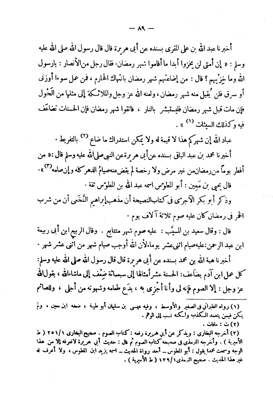 | | أخبرنا عبد الله بن علي المقري بسنده عن أبي هريرة قال : قال رسول الله صلى الله عليه وسلم | وسلم : ' إن أمتي لن يخزوا أبدا ما أقاموا شهر رمضان . فقال رجل من الأنصار يا رسول | الله وما خزيهم ؟ قال : من إضاعتهم شهر رمضان بانتهاك المحارم ، فمن عمل سوءا أو زنى | أو سرق فلن يقبل منه شهر رمضان ، ، ولعنه الله عز وجل والملائكة إلى مثلها من الحول | فإن مات قبل شهر رمضان فليستبشر بالنار ، فاتقوا شهر رمضان فإن الحسنات تضاعف | فيه وكذلك السيئات ' . | | عباد الله إن شهركم هذا لا قيمة له ولا يمكن استدراك ما ضاع بالتفريط . | | أخبرنا محمد بن عبد الباقي بسنده عن أبي هريرة عن النبي صلى الله عليه وسلم قال : ' من | أفطر يوماً من رمضان من غير مرض ولا رخصة لم يقض عنه صيام الدهر كله وإن صامه ' . | | قال يحيى بن معين : أبو المطوس اسمه عبد الله بن المطوس ثقة . | | وذكر أبو بكر الآجري في كتاب النصيحة أن مذهب إبراهيم النخعي أن من شرب | الخمر في رمضان كان عليه صوم ثلاثة آلاف يوم . | | قال : وقال سعيد بن المسيب : عليه صوم شهر متتابع . وقال الربيع ابن أبي ربيعة | ابن عبد الرحمن عليه صيام اثني عشر يوماً ، لأن الله أوجب صيام شهر من اثني عشر شهر . | | أخبرنا هبة الله بن محمد بسنده عن أبي هريرة قال : قال رسول الله صلى الله عليه وسلم : | كل عمل ابن آدم يضاعف : الحسنة عشر أمثالها إلى سبعمائة ضعف إلى ما شاء الله ، يقول الله | عز وجل : إلا الصوم فإنه لي وأنا أجزي به ، يدع طعامه وشهوته من أجلي ، وللصائم |