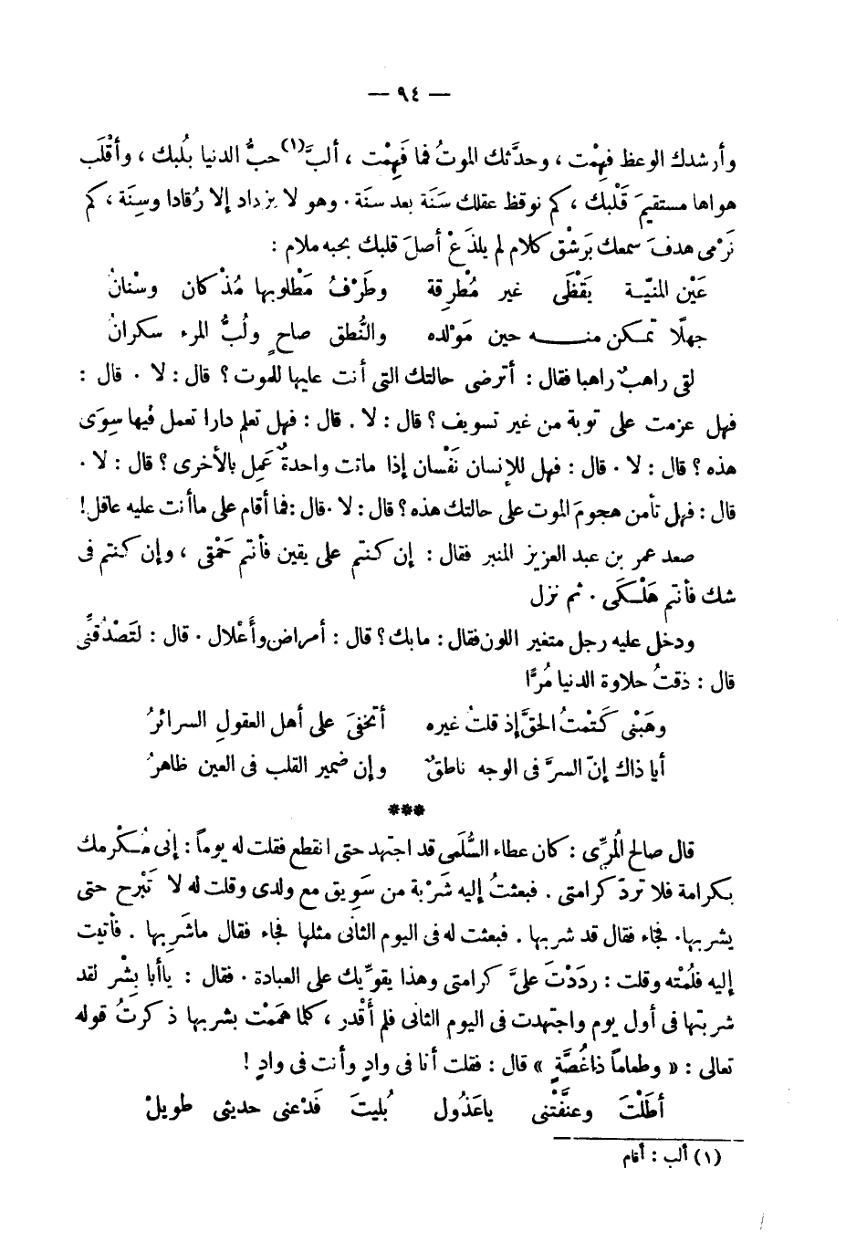 | وأرشدك الوعظ فهمت ، وحدثك الموت فما فهمت ، ألب حب الدنيا بلبك ، وأقلب | هواها مستقيم قلبك ، كم نوقظ عقلك سنة بعد سنة . وهو لا يزداد إلا رقادا وسنة ، كم | نرمي هدف سمعك برشق كلام لم يلذع أصل قلبك بحبه ملام : | | ( عين المنية يقظى غير مطرقة % وطرف مطلوبها مذ كان وسنان ) % | | ( جهلا تمكن منه حين مولده % والنطق صاح ولب المرء سكران ) % | | لقي راهب راهبا فقال : أترضى حالتك التي أنت عليها للموت ؟ قال : لا . قال : | فهل عزمت على توبة من غير تسويف ؟ قال : لا . قال : فهل تعلم دارا تعمل فيها سوى | هذه ؟ قال : لا . قال : فهل للإنسان نفسان إذا ماتت واحدة عمل بالأخرى ؟ قال : لا . | قال : فهل تأمن هجوم الموت على حالتك هذه ؟ قال : لا . قال : فما أقام على ما أنت عليه عاقل ! | | صعد عمر بن عبد العزيز المنبر فقال : إن كنتم على يقين فأنتم حمقى ، وإن كنتم في | شك فأنتم هلكى . ثم نزل . | | ودخل عليه رجل متغير اللون فقال : ما بك ؟ قال : أمراض وأعلال . قال : لتصدقني | قال : ذقت حلاوة الدنيا مرا | | ( وهبني كتمت الحق إذ قلت غيره % أتخفى على أهل العقول السرائر ) % | | ( أيا ذاك إن السر في الوجه ناطق % وإن ضمير القلب في العين ظاهر ) % | | قال صالح المري : كان عطاء السلمي قد اجتهد حتى انقطع فقلت له يوما : إني مكرمك | بكرامة فلا ترد كرامتي . فبعثت إليه شربة من سويق مع ولدي وقلت له لا تبرح حتى | يشربها . فجاء فقال قد شربها . فبعثت له في اليوم الثاني مثلها فجاء فقال ما شربها . فأتيت | إليه فلمته وقلت : رددت علي كرامتي وهذا يقويك على العبادة . فقال : يا أبا بشر لقد | شربتها في أول يوم واجتهدت في اليوم الثاني فلم أقدر ، كلما هممت بشربها ذكرت قوله | تعالى : ' وطعاما ذا غصة ' قال : فقلت أنا في واد وأنت في واد ! | | ( أطلت وعنفتني يا عذول % بليت فدعني حديثي طويل ) % |