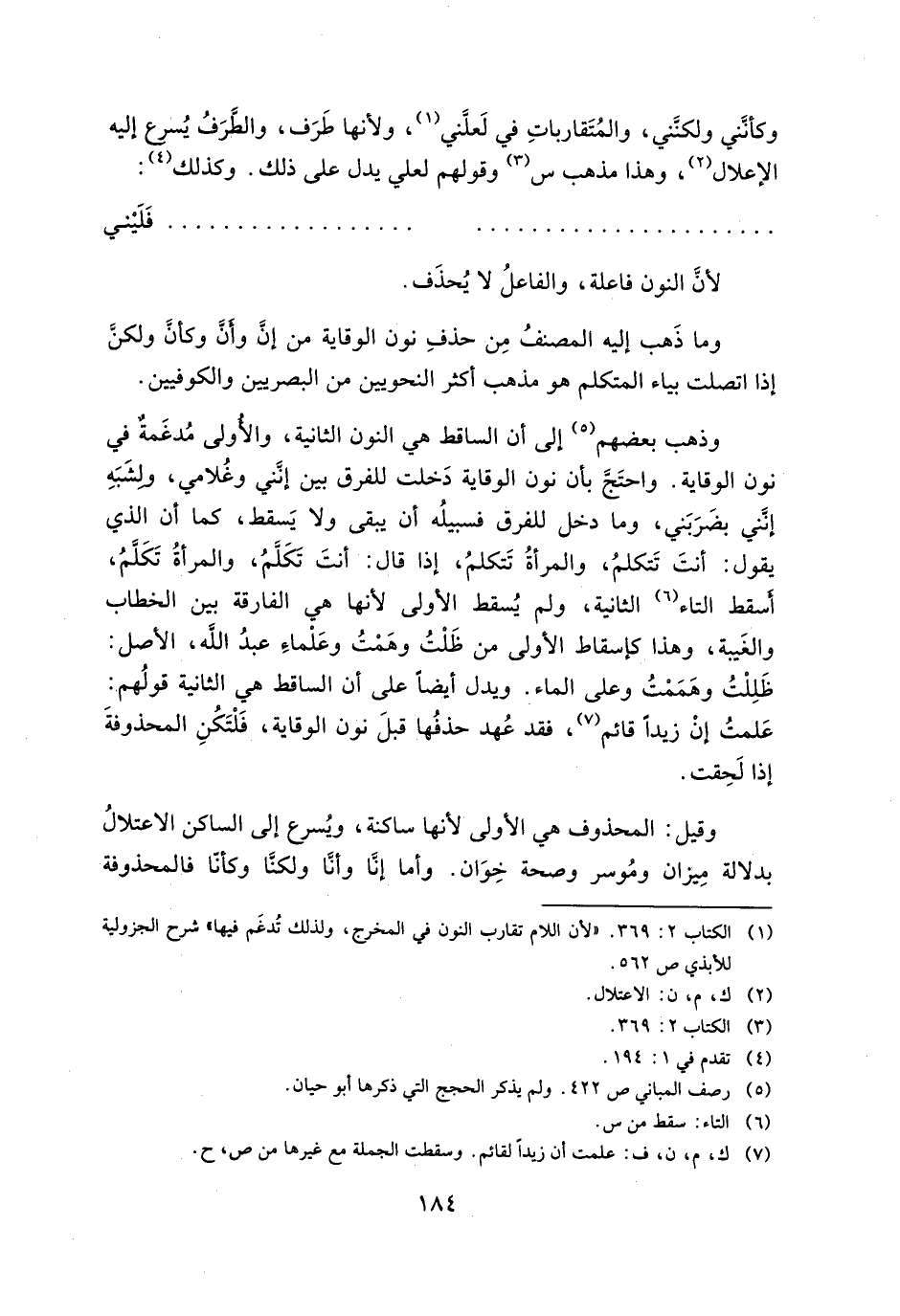 وذهب بعضهم إلى أن الساقط هو النون الثانية، والأولى مدعمة في نون الوقاية. واحتج بأن نون الوقاية دخلت للفرق بين إنني وغلامي، ولشبه إنني يضربني، وما دخل للفرق فسبيله أن يبقى ولا يسقط، كما أن الذي يقول: أنت تتكلم، والمرأة تتكلم، إذا قال: أنت تتكلم، والمرأة تكلم، أسقط التاء الثانية ولم يسقط الأولى لأنها هي الفارقة بين الخطاب والغيبة، وهذا كإسقاط الأولى من ظلت وهمت وعلماء عبد الله، الأصل: ظللت وهممت وعلى الماء. ويدل أيضاً على أن الساقط هي الثانية قولهم: علمت إن زيداً قائم، فقد عهد حذفها قبل نون الوقاية، فلتكن المحذوفة إذا لحقت.