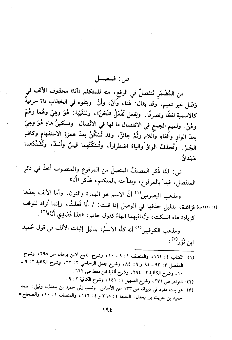 من المضمر منفصل في الرفع، منه للمتكلم "أنا "محذوف الألف في وصل غير تميم، وقد يقال: هنا، وآن، وأن. ويتلوه في الخطاب تاء حرفية كالإسمية لفظًا وتصرفًا. ولفعل نفعل "نحن "، وللغيبة: هو وهي وهما وهم وهن. ولميم الجمع في الإنفصال ما لها في الإتصال. وتسكين هاء هو وهي بعد الواو والفاء واللام وثم جائز، وقد تسكن بعد همزة الإستفهام وكاف الجر. وتحذف الواو والياء اضطرارًا، وتسكنهما قيس وأسد، وتشددهما همدان.]-