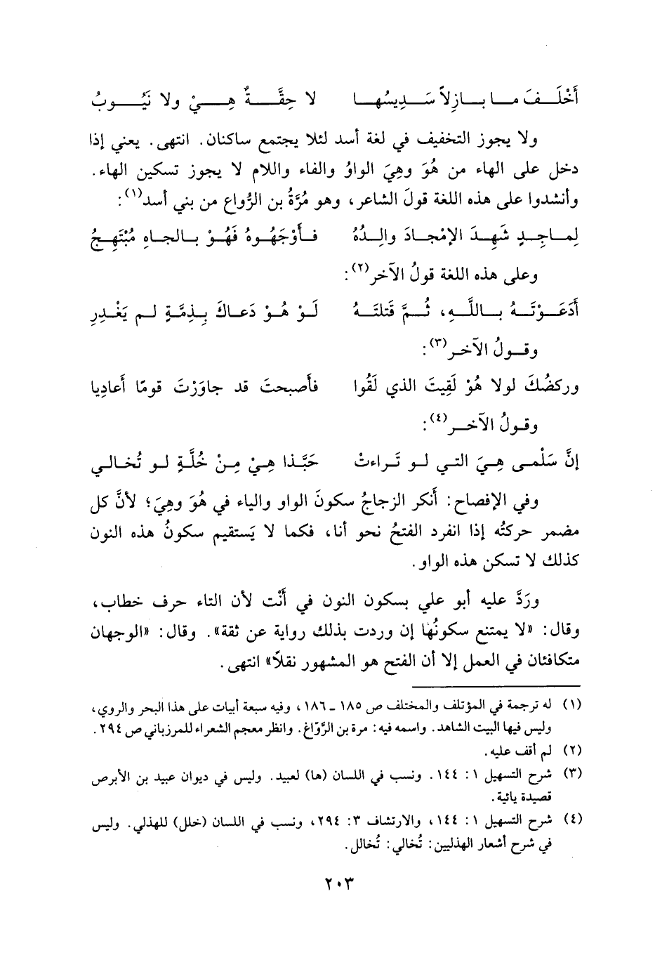 ولا يجوز التخفيف في لغة أسد لئلا يجتمع ساكنان. انتهى. يغني إذا دخل على الهاء من هو وهي الواو والفاء واللام لا يجوز تسكين الهاء. وأنشدوا على هذه اللغة قول الشاعر، وهو مرة بن الرواع من بني أسد:
