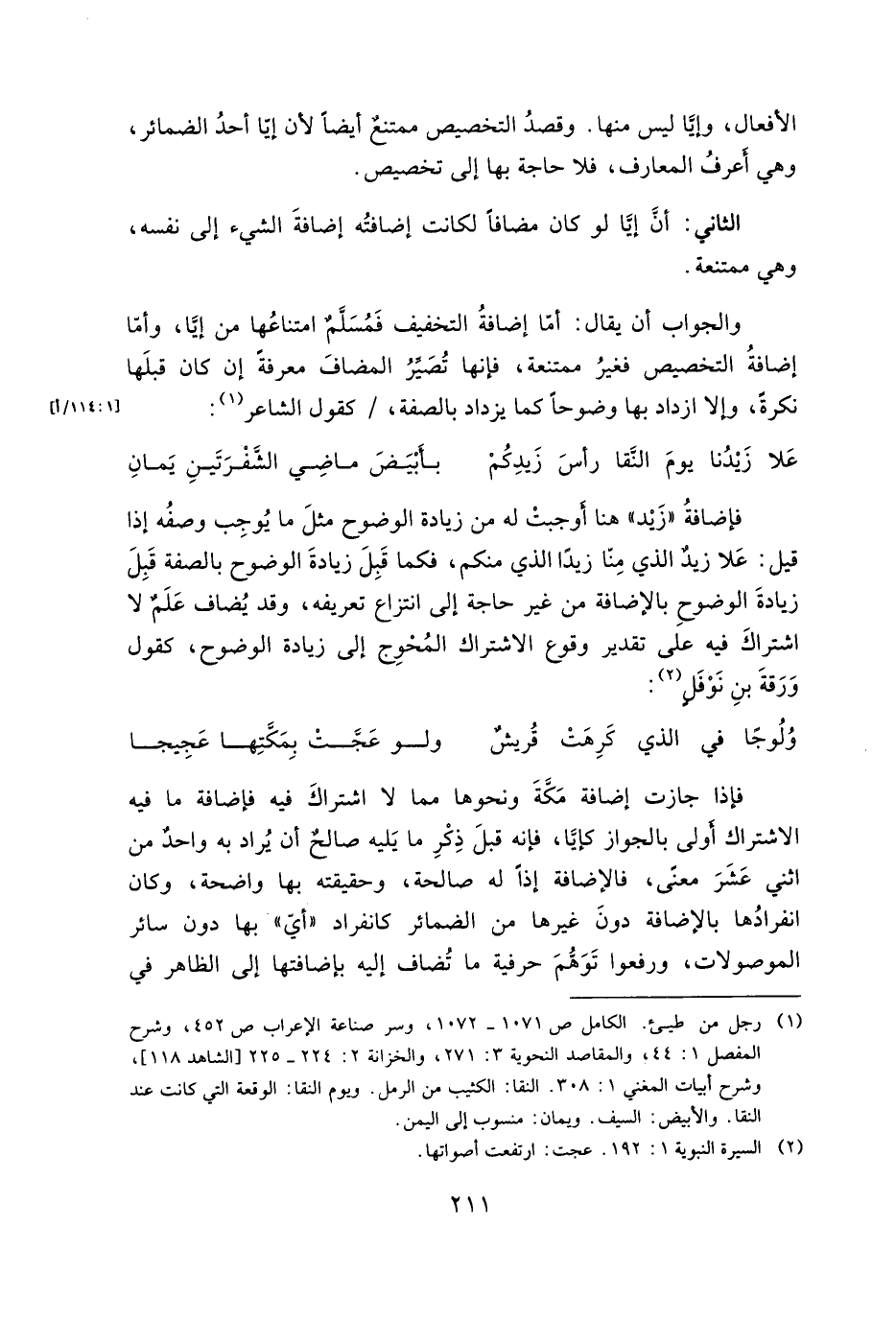 والجواب أن يقال: أما إضافة التخفيف فمسلم امتناعها من إيا، وأما إضافة التخصيص فغير ممتنعة، فإنها تصير المضاف معرفة إن كان قبلها نكرة، وإلا ازداد بها وضوحا كما يزداد بالصفة، / كقول الشاعر: