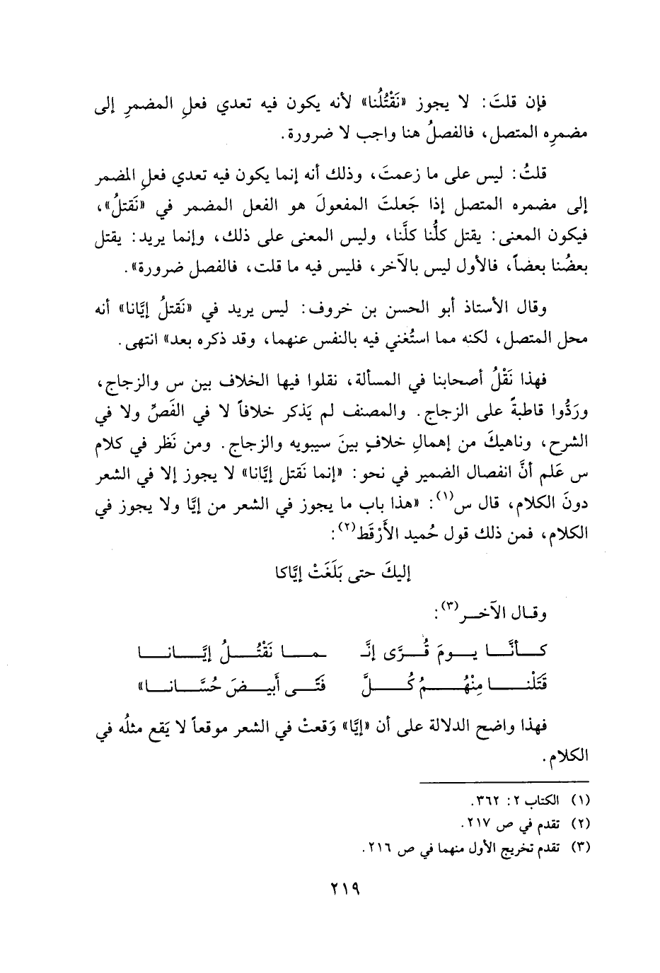 فهذا نقل أصحابنا في المسألة، نقلوا فيها الخلاف بين س والزجاج، وردوا قاطبة علي الزجاج. والمصنف لم يذكر خلافا لا في الفص ولا في الشرح، وناهيك من إهمال خلاف بين سيبويه والزجاج. ومن نظر في كلام س علم أن انفصال الضمير في نحو: "إنما نقتل إيانا" لا يجوز إلا في الشعر دون الكلام، قال س: "هذا باب ما يجوز في الشعر من إيا ولا يجوز في الكلام، فمن ذلك قول حميد الارقط: