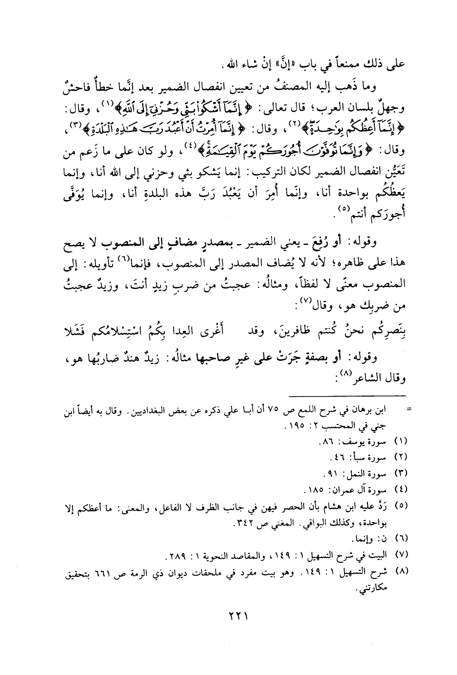 وما ذهب إليه المصنف من تعيين انفصال الضمير بعد إنما خطأ فاحش وجعل بلسان العرب؛ قال تعالي: {إِنَّمَآ أشْكُوا بَثِّي وَحُزْنِي إِلَي اللهِ}، وقال: {إِنَّمَآ أَعِظُكُم بِوَاحِدَةٍ}، وقال: {إِنَّمَآ أُمِرْتُ أَنْ أَعْبُدَ رَبَّ هَذِهِ الْبَلْدَةِ}، وقال: {وَإِنَّمَآ تُوَفَّوْنَ أُجُورَكُمْ يَوْمَ الْقِيَامَةِ}، ولو كان علي ما زعم من تعين انفصال الضمير لكان التركيب: إنما يشكو بثي وحزني إلي الله أنا، وإنما يعظكم بواحدة أنا، وإنما أمر أن أن يعبد رب هذه البلدة أنا، وإنما يوفي أجوركم أنتم.