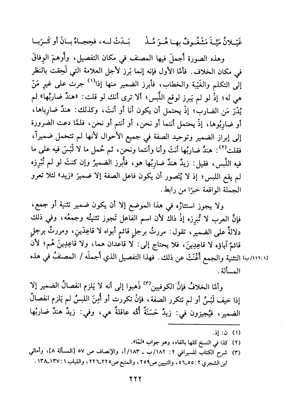 وأما الخلاف فإن الكوفيين ذهبوا إلي أنه لا يلزم انفصال الضمير إلا إذا خيف لبس أو لم تتكرر الصفة، فإن تكررت أو أمن اللبس لم يلزم انفصال الضمير، فيجيزون في: زيد حسنة أمه عاقله هي، وفي: زيد هند ضاربها