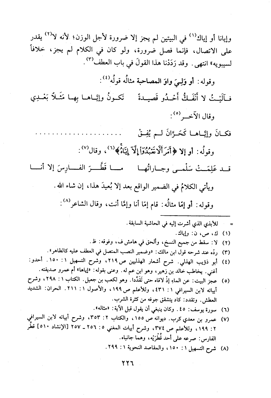 وإيانا أو إياك في البيتين لم يجز إلا الضرورة لأجل الوزن؛ لأنه لا يقدر علي الاتصال، فإنما فصل ضرورة، ولو كان في الكلام لم يجز، خلافا لسيبويه" انتهي. وقد رددنا هذا القول في باب العطف.