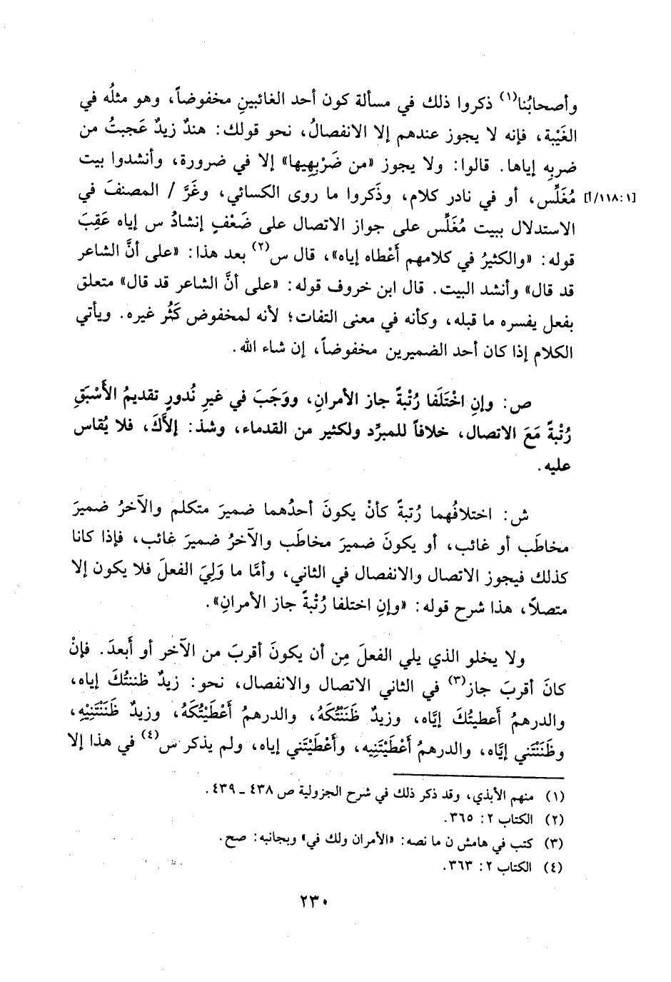 وأصحابنا ذكروا ذلك في مسألة كون أحد الغائبين مخفوضا، وهو مثله في الغيبة، فإنه لا يجوز عندهم إلا الانفصال، نحو قولك: هند زيد عجبت من ضربه إياها. قالوا: ولا يجوز "من ضربهيها" إلا في ضرورة، وأنشدوا بيت مغلس، أو في نادر كلام، وذكروا ما روي الكسائي، وغر / المصنف في الاستدلال ببيت مغلس علي جواز الاتصال علي ضعف إنشاد س إياه عقب قوله: "والكثير في كلامهم أعطاه إياه"، قال س بعد هذا: "علي أن الشاعر قد قال" وأنشد البيت. قال ابن خروف قوله: "علي أن الشاعر قد قال" متعلق بفعل يفسره ما قبله، وكأنه في معني التفات؛ لأنه لمخفوض كثر غيره. ويأتي الكلام إذا كان أحد الضميرين مخفوضا، إن شاء الله.