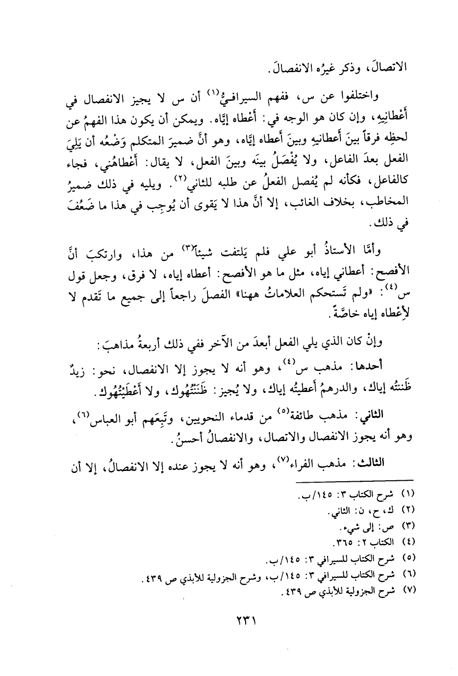واختلفوا عن س، ففهم السيرافي أن س لا يجيز الانفصال في أعطانيه، وإن كان هو الوجه في: أعطاه إياه. ويمكن أن يكون هذا الفهم عن لحطه فرقًا بين أعطانيه وبين أعطاه إياه، وهو أن ضمير المتكلم وضعه أن يلي الفعل بعد الفاعل، ولا يُفضل بينه وين الفعل، لا يقال: أعطاهني، فجاء كالفاعل، فكأنه لم يُفضل الفعل عن طلبه للثاني. ويليه في ذلك ضمير المخاطب، بخلاف الغائب، إلا أن هذا لا يقوى أن يوجب في هذا ما ضعف في ذلك.
