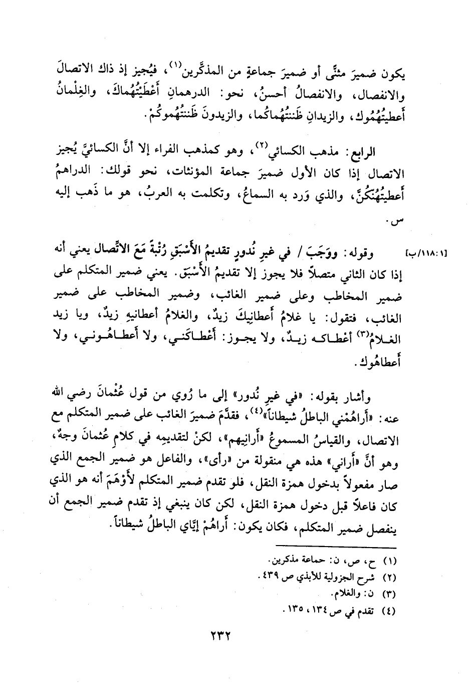 الرابع: مذهب الكسائي، وهو كمذهب الفراء إلا أن الكسائي يُجيز الاتصال إذا كان الأول ضمير جماعة المؤنثات، نحو قولك: الدراهم أعطيتهنكن، والذي ورد به السماع، وتكلمت به العرب، هو ما ذهب إليه س.