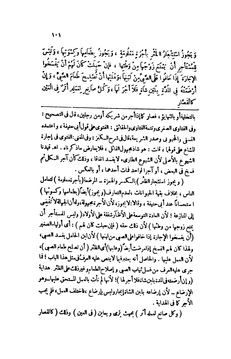 ويجوز استئجار الظئر بأجرةٍ معلومةٍ، ويجوز بطعامها وكسوتها، وليس للمستأجر أن يمنع زوجها من وطئها، فإن حبلت كان لهم أن يفسخوا الإجارة إذا خافوا على الصبي من لبنها، وعليها أن تصلح طعام الصبي، وإن أرضعته في المدة بلبن شاةٍ فلا أجر لها، وكل صنعٍ لعمله أثرٌ في العين كالقصار