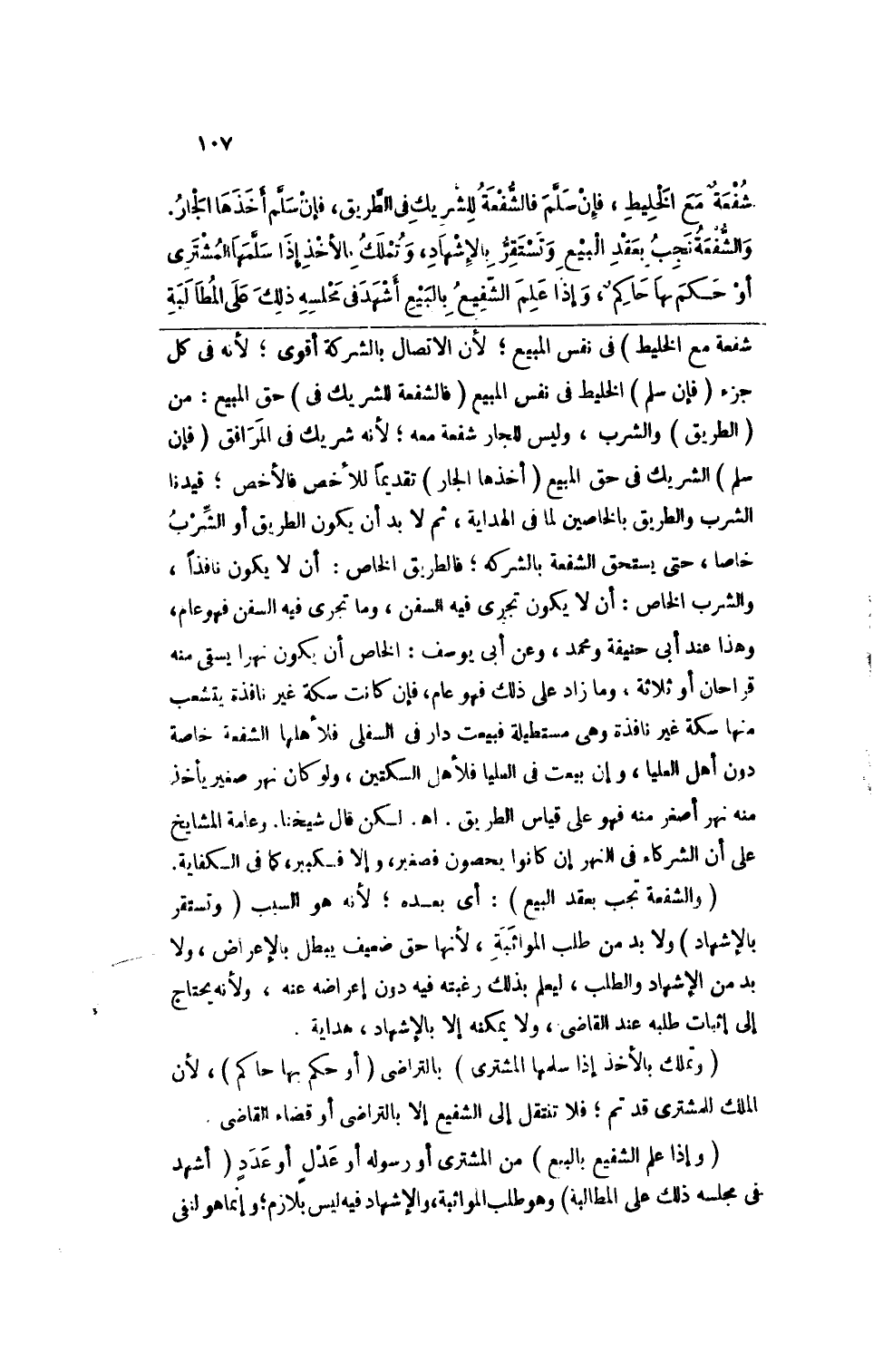شفعة مع الخليط) في نفس المبيع؛ لأن الاتصال بالشركة أقوى؛ لأنه في كل جزء (فإن سلم) الخليط في نفس المبيع (فالشفعة للشريك في) حق الميع: من (الطريق) والشرب، وليس للجار شفعة معه؛ لأنه شريك في المرافق (فإن سلم) الشريك في حق المبيع (أخذها الجار) تقديماً للأخص فالأخص؛ قيدنا الشرب والطريق بالخاصين لما في الهداية، ثم لابد أن يكون الطريق أو الشرب خاصا، حتى يستحق الشفعة بالشركة؛ فالطريق الخاص: أن لا يكون نافذاً، والشرب الخاص: أن لا يكون تجري فيه السفن، وما تجري فيه السفن فهو عام، وهذا عند أبي حنيفة ومحمد، وعن أبي يوسف: الخاص أن يكون نهرا يسقي منه قراحان أو ثلاثة، وما زاد على ذلك فهو عام، فإن كانت سكة غير نافذة يتشعب منها سكة غير نافذة وهي مستطيلة فبيعت دار في السفلى فلأهلها الشفعة خاصة دون أهل العليا، وإن بيعت في العليا فلأهل السكتين، ولو كان نهر صغير يأخذ منه نهر أصغر منه فهو على قياس الطريق. اهـ. لكن قال شيخنا: وعامة المشايخ على أن الشركاء في النهر إن كانوا يحصون فصغير، وإلا فكبير، كما في الكفاية.