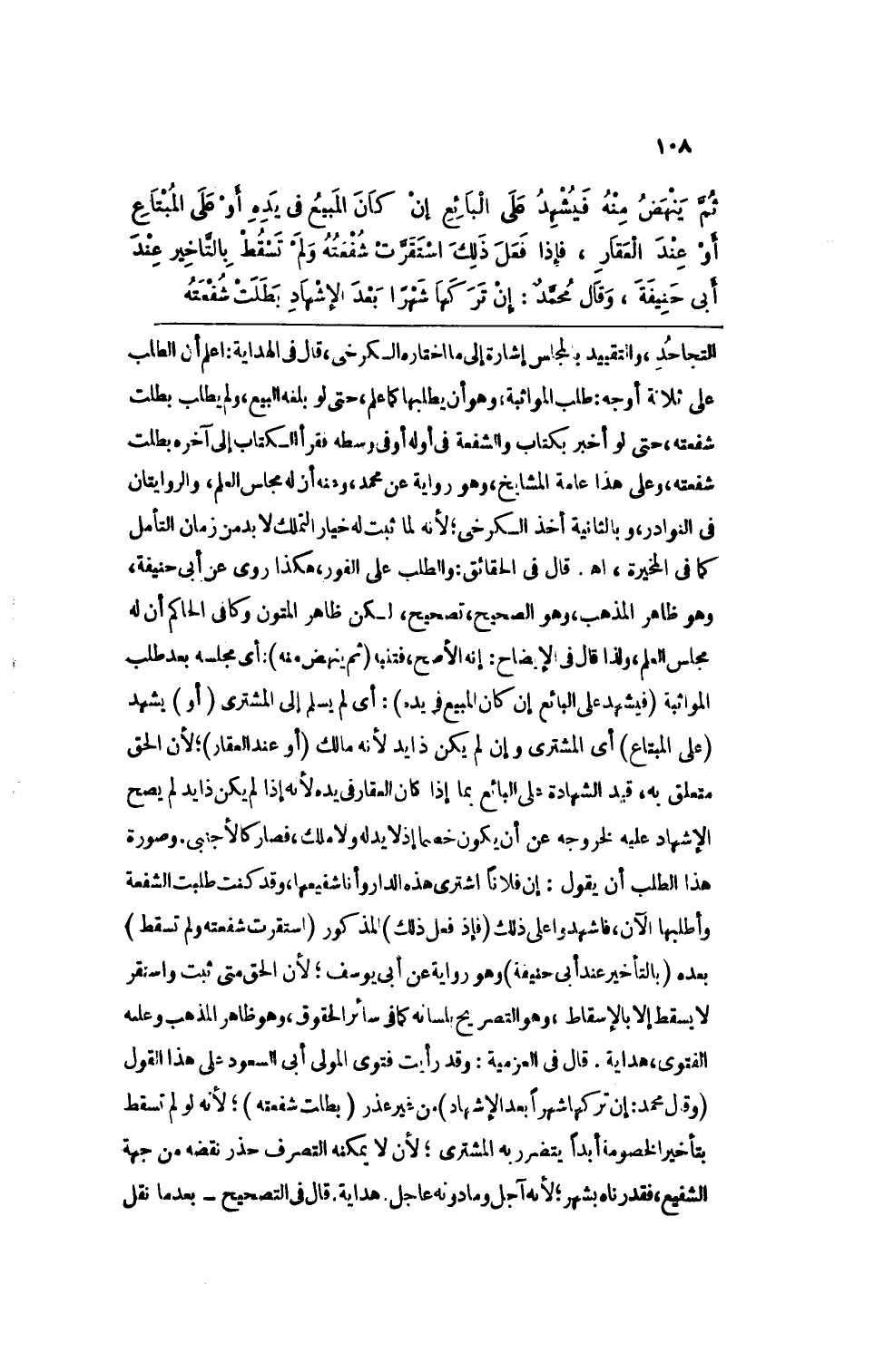 ثم ينهض منه فيشهد على البائع إن كان المبيع في يده أو على المبتاع أو عند العقار، فإذا فعل ذلك استقرت شفعته ولم تسقط بالتأخير عند أبي حنيفة، وقال محمدٌ: إن تركها شهراً بعد الإشهاد بطلت شفعته.