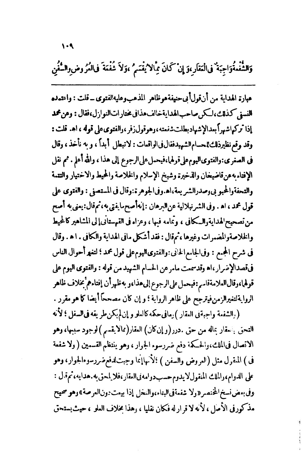عبارة الهداية من أن قول أبي حنيفة هو ظاهر المذهب وعليه الفتوى - قلت: واعتمده النسفي كذلك، لكن صاحب الهداية خالف هذا في مختارات النوازل، فقال: وعن محمد إذا تركها شهراً بعد الإشهاد بطلت شفعته، وهو قول زفر، والفتوى على قوله، اهـ. قلت: وقد وقع نظير ذلك للحسام الشهيد فقال في الواقعات: لا تبطل أبداً، وبه نأخذ، وقال في الصغرى: والفتوى اليوم على قولهما، فيحمل على الرجوع إلى هذا، والله أعلم. ثم نقل الإفتاء به عن قاضيخان والذخيرة وشيخ الإسلام والخلاصة والمحيط والاختيار والتتمة والتحفة والمحبوبي وصدر الشريعة، اهـ. وفي الجوهرة: وقال في المستصفى: والفتوى على قول محمد، اهـ. وفي الشرنبلالية عن البرهان: إنه أصح ما يفتى به، ثم قال: يعني به أصح من تصحيح الهداية والكافي، وتمامه فيها، وعزاه في القهستاني إلى المشاهير كالمحيط والخلاصة والمضمرات وغيرها، ثم قال: فقد أشكل ما في الهداية والكافي. اهـ. وقال في شرح المجمع: وفي الجامع الخاني: والفتوى اليوم على قول محمد؛ لتغير أحوال الناس في قصد الإضرار، اهـ وقد سمعت ما مر عن الحسام الشهيد من قوله: والفتوى اليوم على قولهما، وقال العلامة قاسم: فيحمل على الرجوع إلى هذا، وبه ظهر أن إفتاءهم بخلاف ظاهر الرواية لتغير الزمن فيترجح على ظاهر الرواية؛ وإن كان مصححاً أيضا كما هو مقرر.