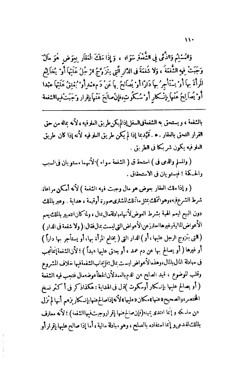 والمسلم والذمي في الشفعة سواءٌ، وإذا ملك العقار بعوضٍ هو مالٌ وجبت فيه الشفعة، ولا شفعة في الدار التي يتزوج الرجل عليها أو يخالع المرأة بها أو يستأجر بها داراً أو يصالح بها عن دم عمدٍ أو يعتق عليها عبدا أو يصالح عنها بإنكارٍ أو سكوت، فإن صالح عنها بإقرار وجبت فيها الشفعة